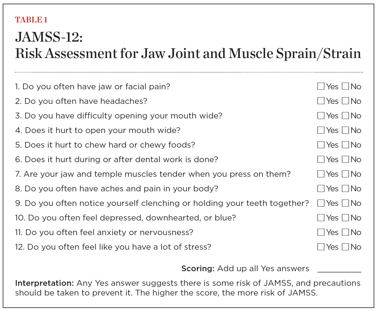 The JAMSS protocol employs a quick and easy-to-implement assessment—the “A” in SAFE—for determining preoperative risk, which can also function as a postoperative evaluation. The process starts with a 12-question verbal assessment with the patient, which generally takes just a few minutes (Table 1). Research suggests that the factors in this assessment are strong predictors of initial onset of TMD.5,7,9,10 The questions address pain on jaw opening, history of headache or facial pain, limited range of motion, emotional and general body factors, and potential stress.13-22