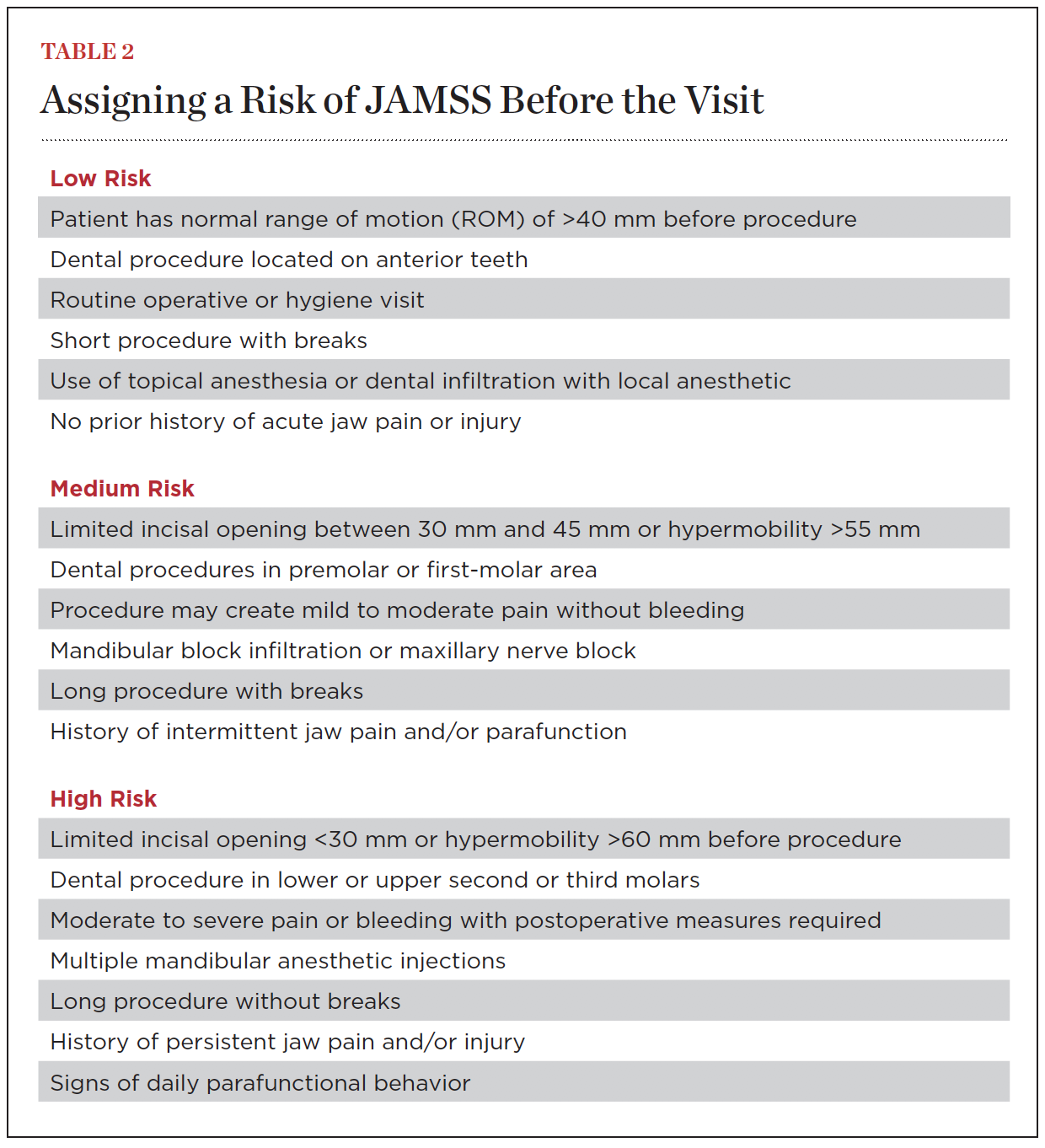 The last area of assessment involves dental procedures. Some initiating factors for development of JAMSS are direct trauma due to a nerve block, sustained or forceful contraction of the muscles that can be worsened by use of a bite block, hyperextension of the muscles due to opening too wide, or prolonged stretching of the muscles.2-4,7-10 These factors have been merged and distilled down to a few simple questions about the procedure to assign a risk category. In general, the further back in the mouth the clinician will be working, the longer the procedure, and the more downward pressure being put on the mandible, the greater the procedural risk.