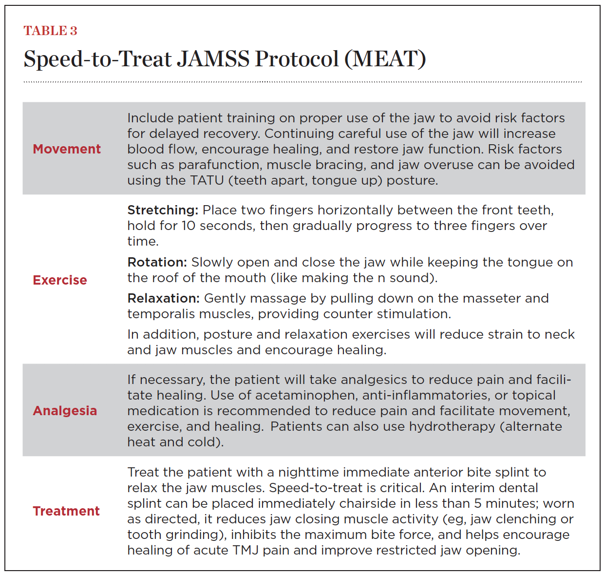 To minimize the risk that the patient will develop chronic jaw pain, earaches, temple headaches, or jaw dysfunction, a “speed-to-treat” JAMSS protocol is recommended.17,20 The sooner the protocol is initiated, the better the outcome. Being alerted to these signs and symptoms on the day they develop is ideal. The protocol includes four steps, known by the acronym MEAT: movement, exercises, analgesia, and treatment (Table 3). This orthopedic model engages patients in their own self-care, guides them on monitoring their condition and instituting behavior change, and augments their recovery with a simple device that is both diagnostic and therapeutic. Completing these four steps maximizes the potential for success in reducing pain and dysfunction at the acute stage.