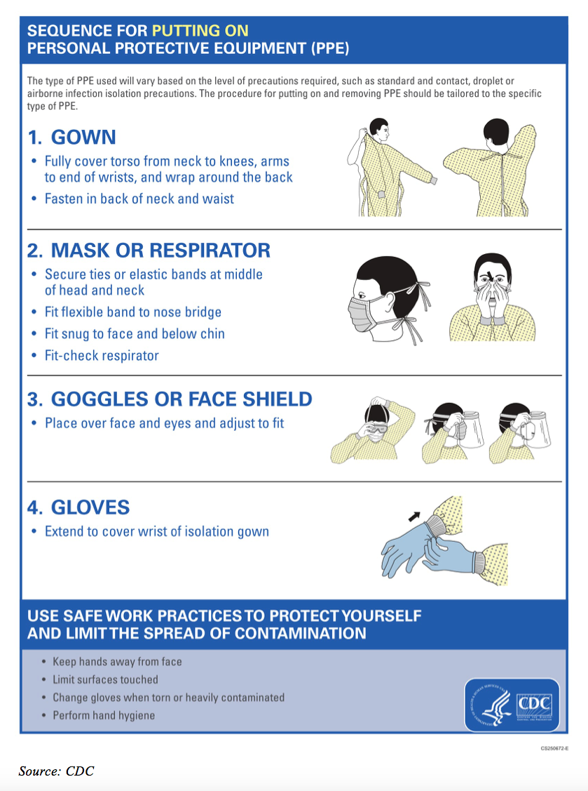 The donning sequence is: gowns, masks, eye protection, and, finally, gloves. The CDC series supports wearing long-sleeved gowns and then placing gloves over the wrists. Thus, the gloves are extended over the cuffs of the gowns, leaving no exposed skin.