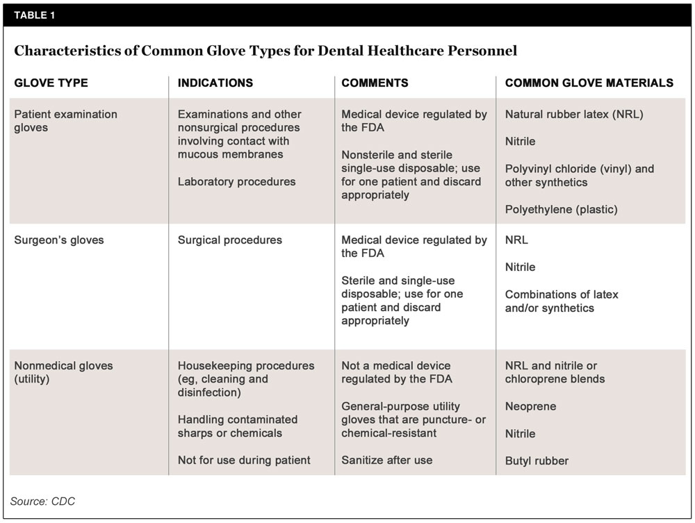 The Centers for Disease Control and Prevention (CDC) has prepared a table describing characteristics of common glove types (Table 1).12