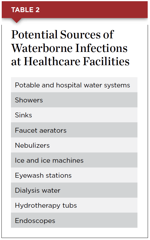 Infections and diseases caused by waterborne organisms remain a major source of global morbidity and mortality.1 These include pathologies caused by a variety of bacteria, protozoa, viruses, and intestinal parasites. Many are able to thrive and proliferate in contaminated natural water sources as well as in man-made systems containing waterlines designed to provide water for public consumption, building equipment, and use in healthcare facilities. While certain well-known bacterial pathogens (ie, Salmonella Typhi, Vibrio cholerae, Escherichia coli) are responsible for a substantial portion of the disease burden, especially in developing countries, a number of new pathogens transmitted by contaminated water have been described in recent decades. These include Cryptosporidium parvum (1976), Legionella pneumophila (1977), and noroviruses (1972), as well as more virulent strains of previously known bacteria, such as Vibrio cholerae O139:H7 (1992). A partial list of major infectious agents that can be spread by water is presented in Table 1.