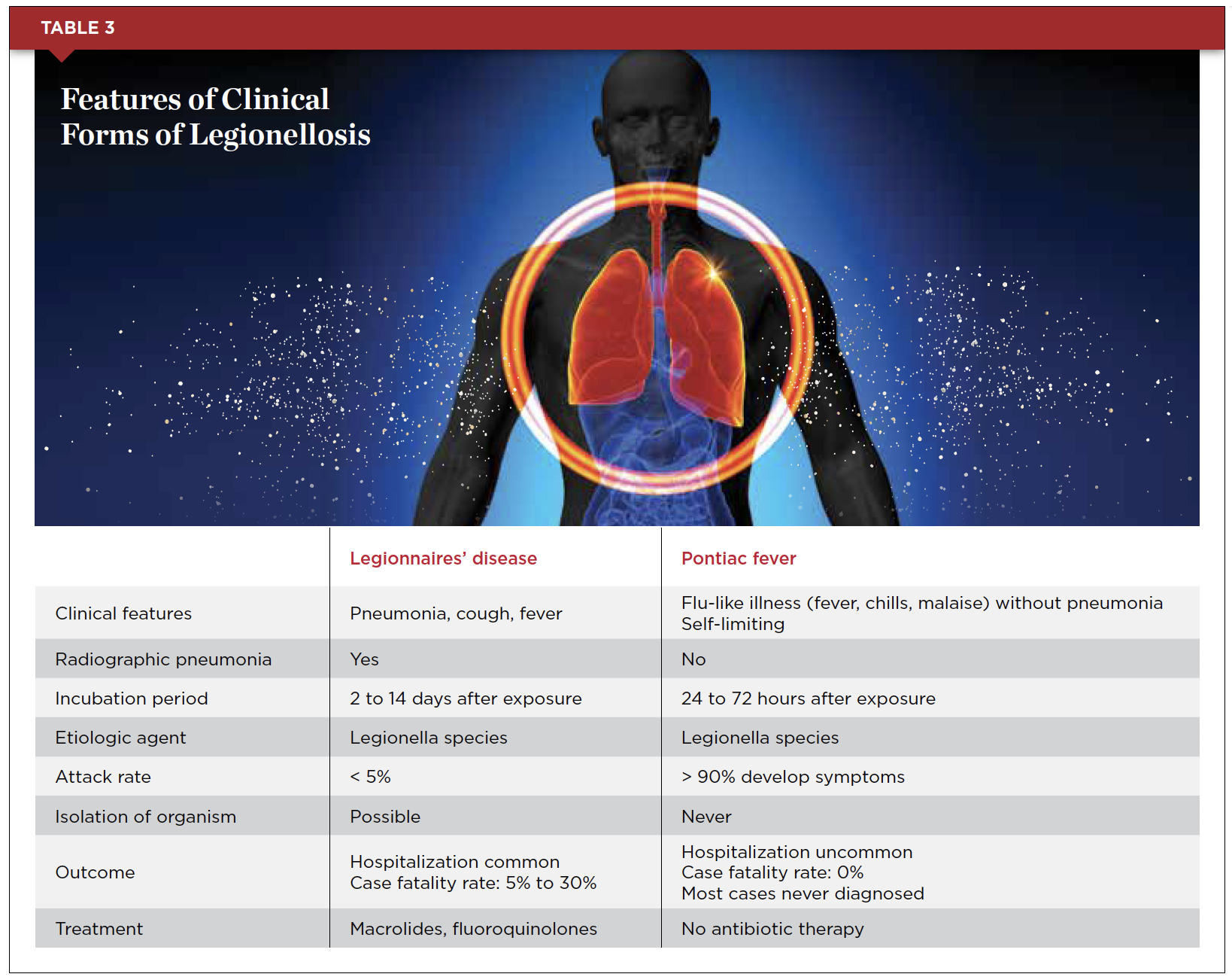 Although Legionella species are ubiquitous in many aqueous environments, they rarely cause disease. Despite this fact, L. pneumophila is the most commonly reported cause of waterborne legionellosis infections and outbreaks among humans. These organisms are not typically considered to be highly virulent pathogens; instead, they are classified as “opportunistic pathogens” and frequently found to cause respiratory disease manifestations in immunocompromised individuals. Infection develops after aerosolized bacteria enter the lungs, where they are encountered by alveolar macrophages and phagocytized. Next, the bacteria produce virulence factors that allow the engulfed Legionella to both survive and replicate within the inflammatory cell. Eventually, the macrophage lyses, and the increased concentration of bacteria is released to affect other phagocytic cells. As the microbial concentrations increase dramatically, other cells (eg, neutrophils, other macrophages, erythrocytes) infiltrate the alveoli, resulting in increased capillary permeability (ie, edema). Two clinical forms of legionellosis are known: Legionnaires’ disease and Pontiac fever (Table 3).13,14