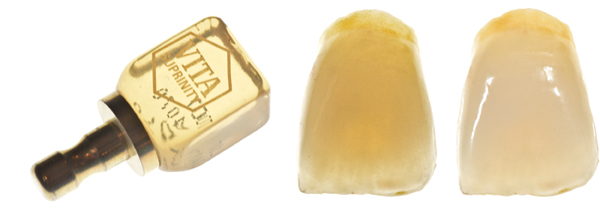 New additions to this category are zirconia-reinforced lithium silicates (ZLSs) (eg, VITA Suprinity®, VITA Zahnfabrik [shown in Figure 12]; CELTRA™ Duo, DENTSPLY). ZLS materials comprise a lithium-silicate glass ceramic that is strengthened with approximately 10% zirconia crystals. Although these materials are still relatively new to the market, initial in vitro testing shows they have excellent optics and physical properties similar to lithium disilicates. Only lithium disilicates, however, have long-term clinical data to support their use as single restorations anywhere in the mouth.