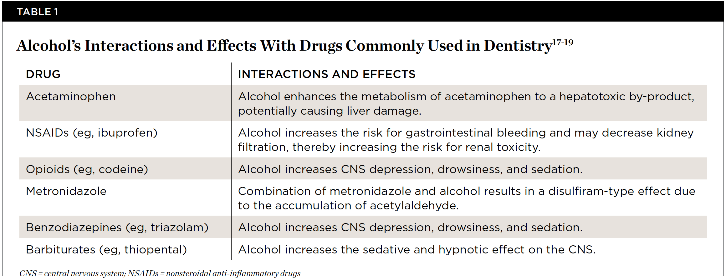 Examples of medications that can interact with alcohol include nonsteroidal anti-inflammatory drugs (NSAIDs), antihistamines, benzodiazepines, barbiturates, and opioids. Table 1 summarises the interaction of alcohol with drugs that are commonly prescribed in dentistry.17-19
