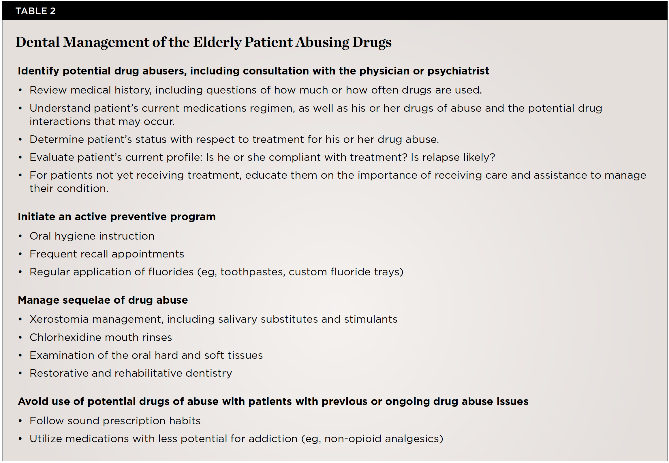 The clinician must also recognize that the management of pain of a dental nature in elderly patients may require a holistic approach and dealing with the sources of pain, rather than a purely pharmacological approach. Finally, it is important to recognize when patients may be attempting to acquire prescription medications by "doctor shopping" and to utilize best judgment when making decisions as to when and/or how much to prescribe of any controlled substance with the potential for addiction. Table 2 summarizes the dental management of the elderly patient abusing drugs.