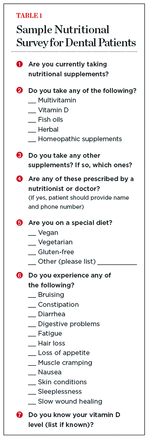 Table 1 includes recommended questions to assess patients’ nutritional status in the dental office. An increasing number of patients are seeing naturopathic doctors, integrative physicians, or nutritionists for supplement prescriptions. It is important to contact these professionals prior to dental implant surgery to review patients’ dietary supplement list as well as associated health conditions.