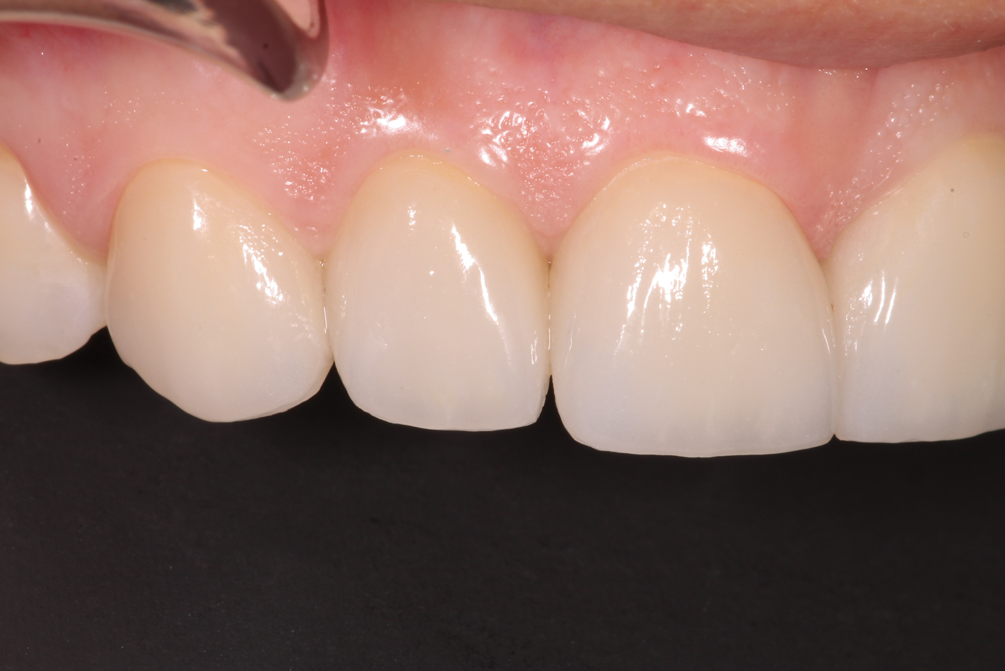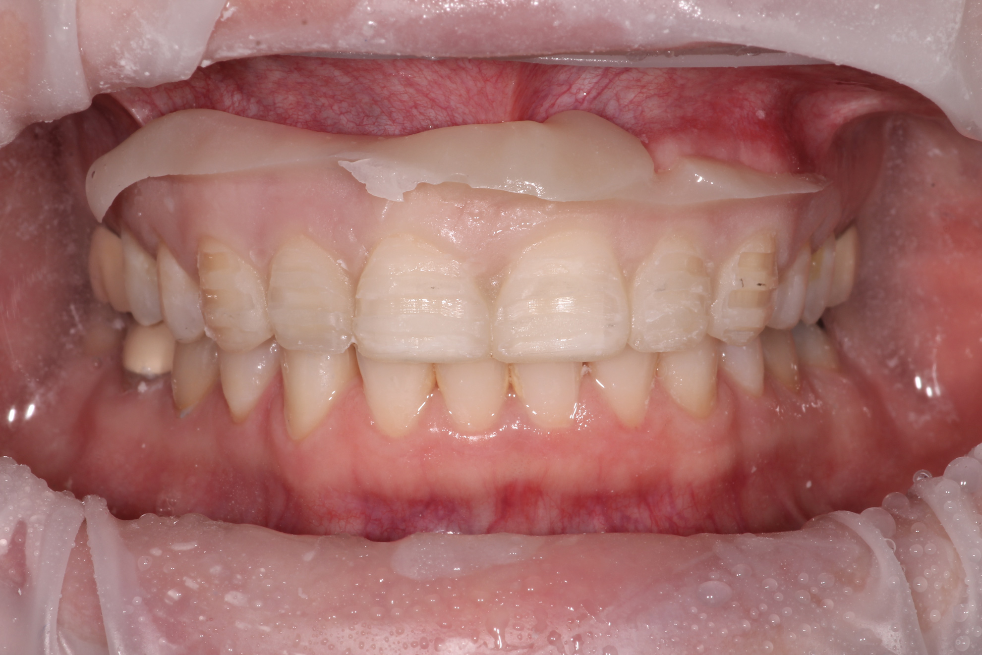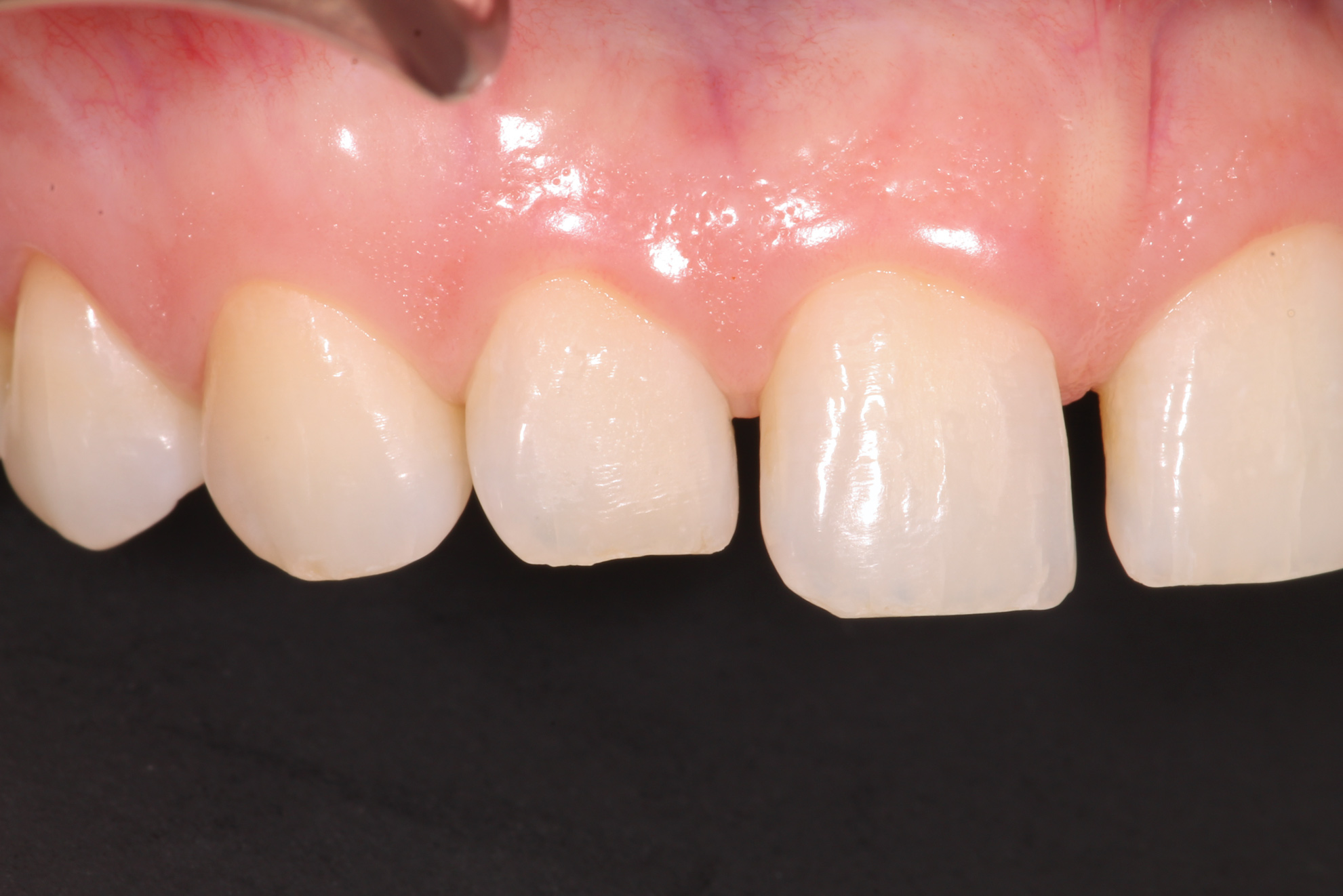 Whether or not to break the contact when preparing anterior veneers is a debatable topic. However, when preparing the interproximal area, one must take into consideration not only the effect of the esthetic contours on the visual presentation but also the effect of the restorative contours on periodontal health because the final restoration will need to house and protect the gingival papilla.15 When a tooth is underprepared, two issues affecting the final restoration can occur. First, the tooth may be over-contoured to allow an adequate volume of material for the final restoration. Over-contoured restorations often have a more negative impact on gingival health and can result in gingival inflammation and difficulty performing oral hygiene procedures.16 Second, as in the case of a diastema closure, black triangles may appear at the gingival embrasures when the laboratory is not given enough room to adequately fill the embrasure space.17 This can be visualized by placing the incisal reduction preparation guide in the mouth to see where the embrasures of the teeth are supposed to emerge (Figure 8); however, it ultimately needs to be tested and evaluated in the provisional stage of treatment. When deciding whether or not to prepare through the interproximal, the dentist must determine if the free gingival margin is in the appropriate position and if the laboratory technician will have adequate room without needing to create bulky contours that impinge on the gingiva.