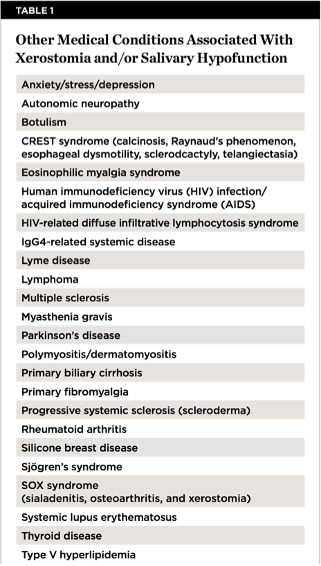 Salivary gland hypofunction, ie, inadequate saliva, may be caused by many conditions. Causes of or conditions associated with xerostomia, which is the sensation of dry mouth, and/or salivary hypofunction are wide ranging and include mouth breathing, smoking tobacco or marijuana, candidiasis, menopause, aging, dehydration, diabetes mellitus, radiation therapy, and a variety of other medical conditions (Table 1). Hundreds of prescription and over-the-counter (OTC) medications have induced salivary gland dysfunction as an adverse effect.1-4 Dry mouth tends to be a more frequent complaint in older individuals,5 and 80% of patients aged 60 years or older have complaints of oral dryness, burning mouth, and taste alterations if they are on medications, even with a normal salivary flow rate.6,7