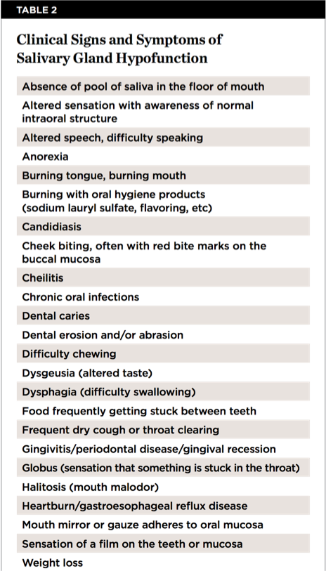 The patient with dry mouth or salivary gland hypofunction may present with a wide range of clinical signs or symptoms (Table 2). Clinical symptoms frequently develop when the salivary flow rate has decreased 50% or more.13 A patient with salivary gland hypofunction may have one or more of these signs and symptoms.