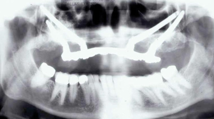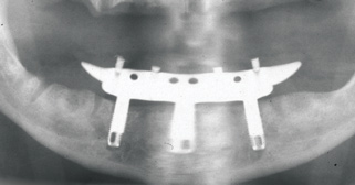 The Toronto Conference in 1982, chaired by Professor George Zarb and presented by Professor Per-Ingvar Brånemark, was a seminal event that changed edentulous treatment planning concepts irrevocably. No longer was it necessary to rebuild lost bone through grafting alone in either arch. The severely atrophic mandible, for example, could be treated with as few as four implants used to support a bone-sparing prosthesis through integrated tooth analogs, as demonstrated in Figure 1 through Figure 3. Here, an 81-year-old patient presented with severe mandibular atrophy (Figure 1) from denture wear since a very young age and had a history of being unable to manage a mandibular prosthesis despite numerous attempts at new denture construction. Four vertical machined-surface osseointegrated implants were placed in 1983 by Professor Brånemark, and all four penetrated the inferior cortex up to 3 mm to 4 mm in depth, as shown on the immediate postoperative panoramic film (Figure 2). At 4 years and 5 months, reparative bone had formed to the apices of all implants (Figure 3), and all of them remained in uncompromised function until the patient passed away at age 90.