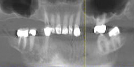 Interceptive implant therapy may then become a consideration earlier in life to create restorations that will not be subject to the latent effect of dental caries as aging continues. An example is shown in Figure 6 and Figure 7; the panoramic film of a 56-year-old man shows several orthognathic and extensive dental procedures historically. All full-coverage restorations had been replaced for a second time, and, again, all evidenced recurrent caries, but the existing dentition was periodontally sound and relatively esthetic.