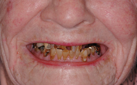 This is an unfortunate mindset in that current advances in protocol and technology can result in significant advantages in addressing some or most of these concerns. The patient shown in Figure 12 may serve to illustrate this point. She had a destroyed maxillary dentition, a less-compromised but highly unesthetic mandibular component, and a single goal: to be able to "smile at my grandchildren again." In consultation with her and her family, it was decided that a double-arch fixed implant approach would most realistically address her esthetic goals and provide her with the desired prosthetic result. She was 102 years old at the time of initial consultation. Using a staged operating-room approach, provisional restorations were initially delivered, followed by subsequent definitive hybrid final restorations. She was able to use these comfortably for the next 6-½ years (Figure 13 and Figure 14).