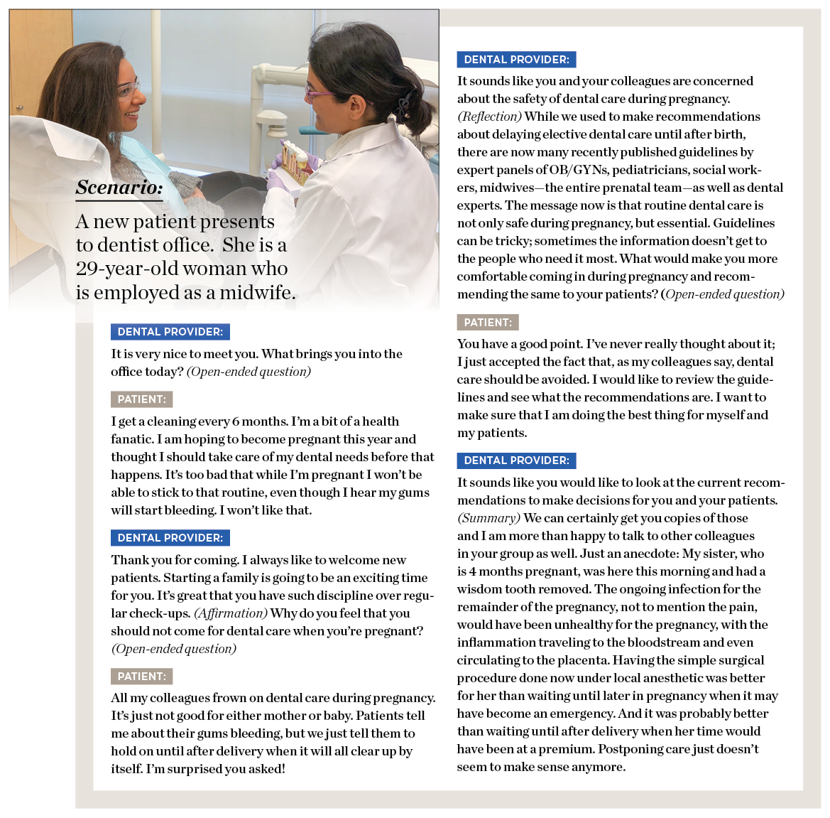 A sample scenario is provided (see below) in which MI is employed for a new patient who discloses her intention to start a family and who believes she should receive dental care before becoming pregnant. The patient is a healthcare professional who is hesitant about receiving dental care during pregnancy.
