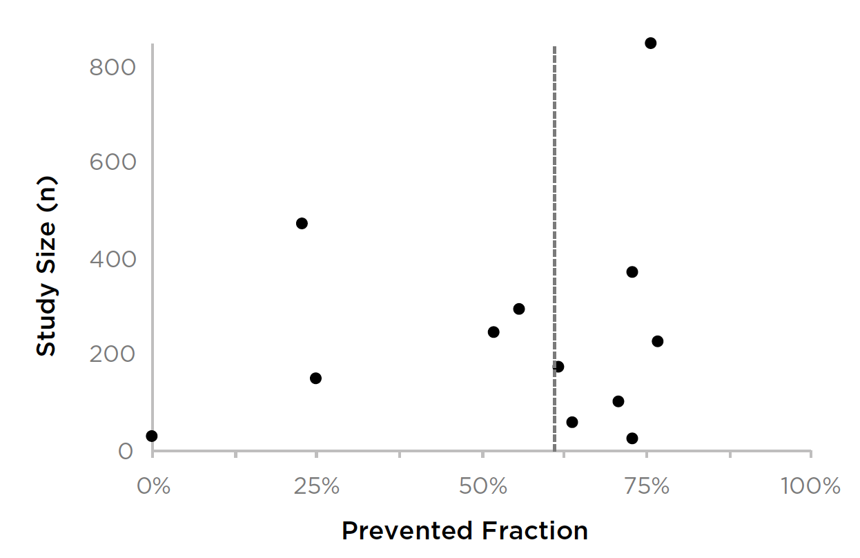 In Figure 2 the number of children included in the summary analysis (SDF and control groups) is plotted against the prevented fraction observed in each study. This type of plot characterizes the overall trend in clinical outcomes and is expected to appear as an upward-pointing funnel converging on the true clinical effect. The estimate of 61% prevented fraction appears reasonable.