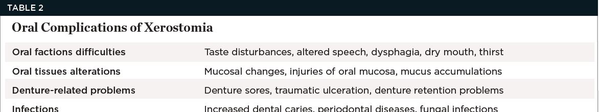 Table 1 provides a summary of drugs commonly associated with xerostomia.
