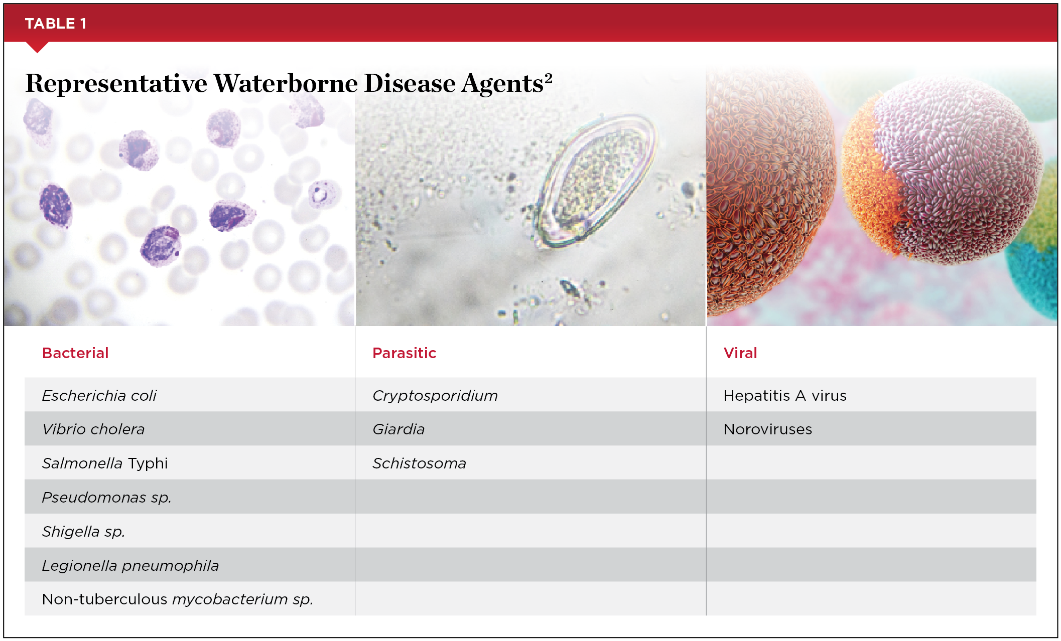 The association between waterborne microorganisms and human disease caused by the contamination of water sources has been documented since the mid-1850s.1 Since then, a wide variety of both microscopic and macroscopic organisms have been shown to survive and proliferate in both natural water and manmade environmental systems (Table 1).2 Although established public health water treatment regulations (ie, filtration and chlorination) have been in effect for many years, waterborne infections and disease outbreaks continue to be reported from drinking water, recreational water, hospital water, and water used in healthcare-related devices. Extensive documentation of these types of infections can be found in the medical literature.3-8 Until recently, outbreaks and severe infections from contaminated water in healthcare settings were primarily reported in hospitals.