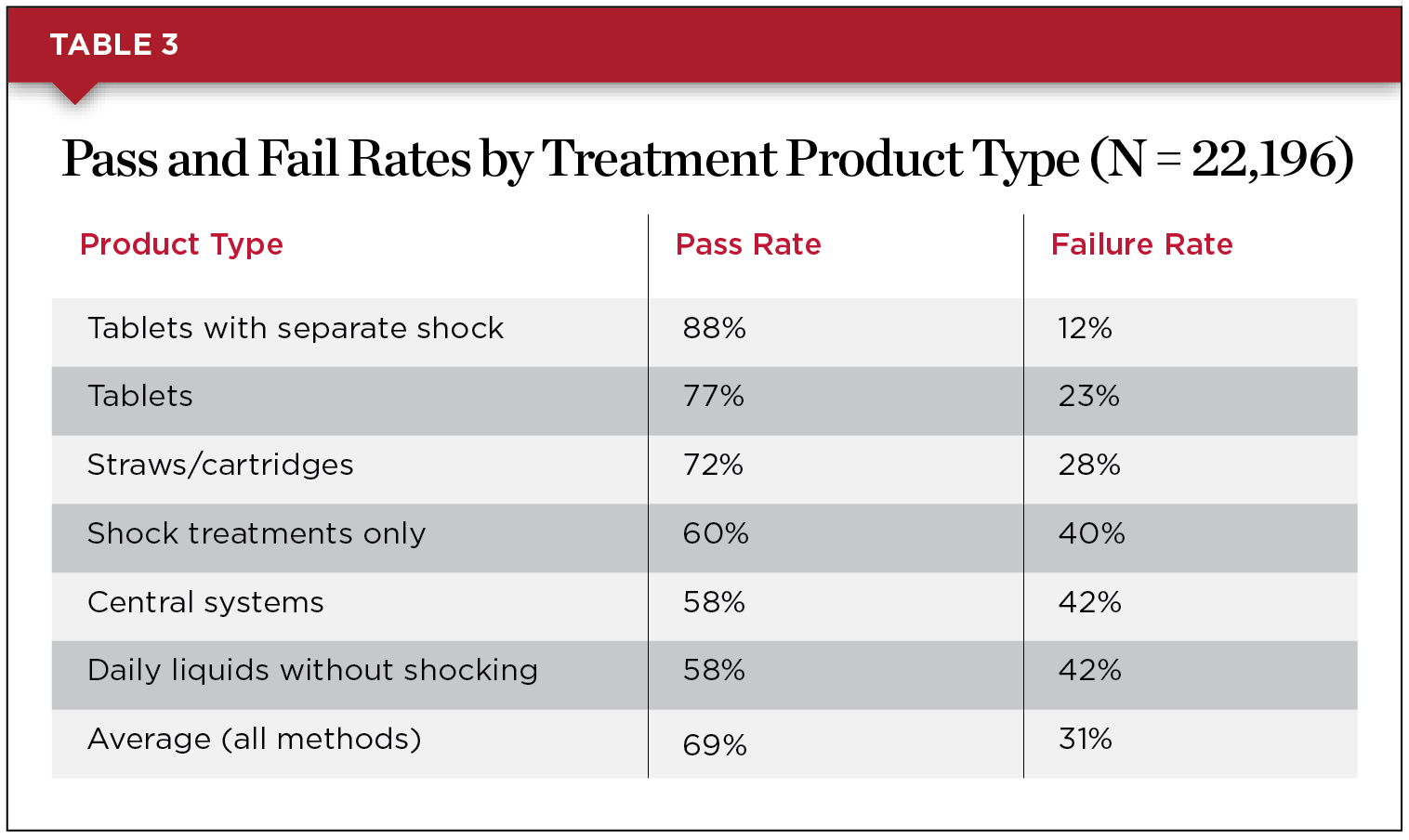 In addition to the comparison of test results for different types of water lines, the test results of lines using various treatment protocols were compared. Table 3 presents field data accumulated from thousands of dental facilities. The data reflect potential misuse of the individual products. Failed water tests are typically corrected after identifying mistakes such as not following the manufacturer's instructions and not shocking on a regular basis.
