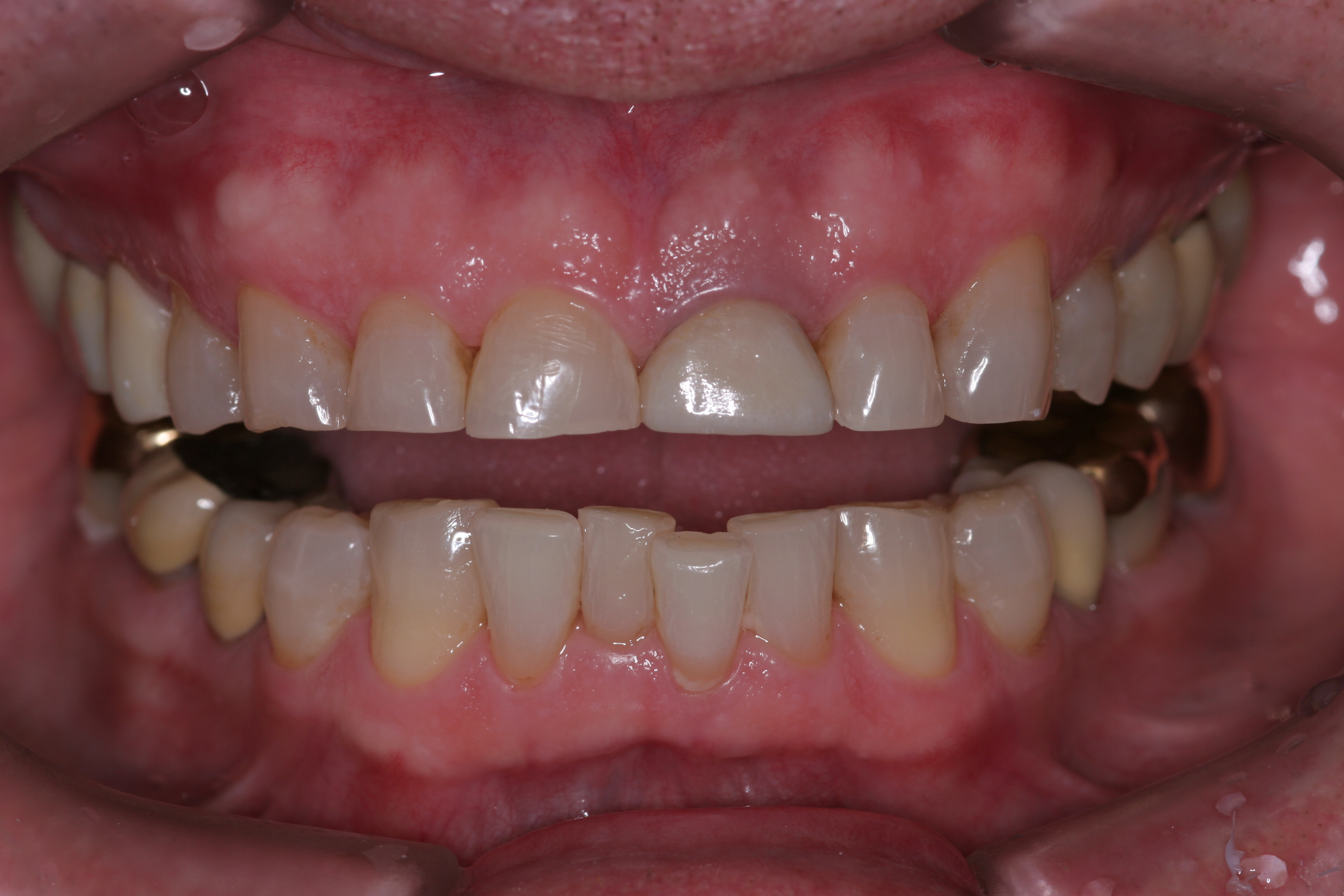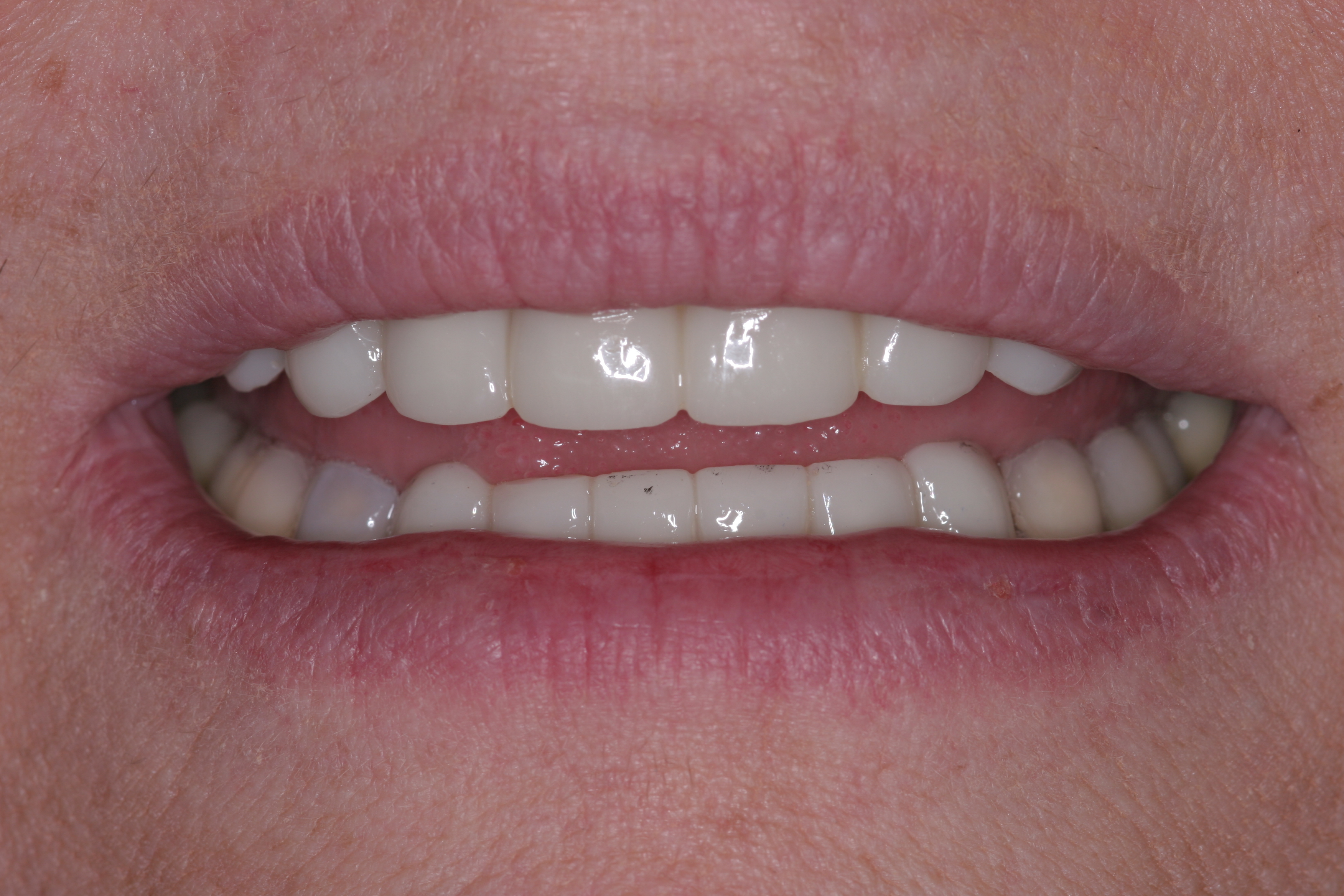 Treatment for this patient included posterior reductive equilibration and additive anterior equilibration (restoration) to eliminate the CR/MIP interferences and to meet the requirements of occlusal stability. Teeth Nos. 5 through 11 and 22 through 27 were prepared for full-coverage lithium-disilicate restorations. Crestal bone heights were evaluated. Soft-tissue crown lengthening was performed on the maxillary anterior teeth by a soft-tissue diode as needed. The esthetic, functional, and phonetic changes were evaluated and confirmed in the provisional restorative phase (Figure 17 through Figure 21).