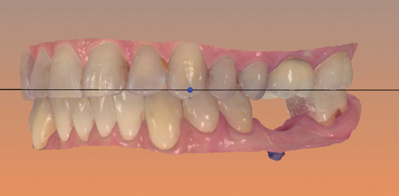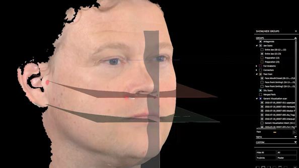2. Standardized reference planes, which are created using facial landmarks and thus establish an idealized dental midline, occlusal plane, and curve of Monson, all of which are tied into the frame of the face at rest and in dynamic movements. These reference planes, along with virtual articulation, basically eliminate the need to use conventional facebows or transfer bows and conventional articulators (Figure 7).