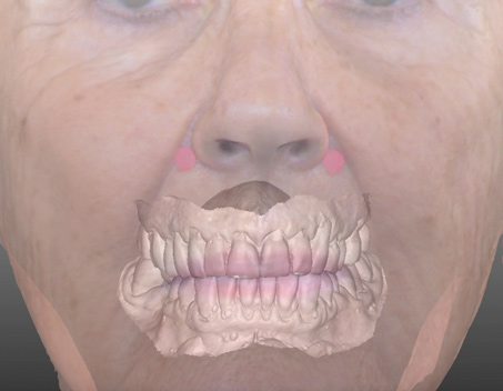 4. The entire set-up allows a preview of hard/soft-tissue augmentation or reduction requirements based on virtual and desired implant positions. It is here that decisions are made as to whether the plan can be achieved, or if pre-prosthetic steps such as orthodontic and orthognathic procedures are necessary to avoid open bites or reverse smiles. The benefit in virtually previewing the lip position relative to the transition zone (tissue-prosthesis interface) may especially be appreciated in all-on-4 or -6 full-arch implant restorations. Bone reduction guides or planned implant positions relative to a "virtually" reduced ridge to allow apical correction of the tissue-prosthesis interface are critical to the esthetic success of a prosthesis. "Face-in" planning literally eliminates this challenge (Figure 10 and Figure 11).