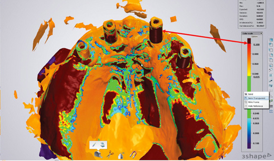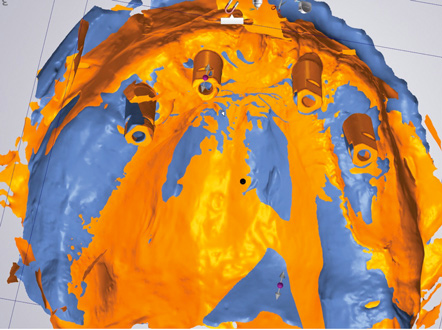 Scan flags themselves can contribute to inaccuracies associated with their shape or design. For example, their depth in the tissue affects how much of the flag remains visible; the torque applied to insert them is a factor; the material of their mating surface to the implant (eg, distortion of polyetheretherketone base material compared to titanium) is a consideration; and the amount of handling and number of uses the scan flag has experienced is a factor. The authors also have found through evaluations that use of multi-unit abutment scan flags, which thus far has been sparsely studied, resulted in significant deviations from conventional impressions comparing the same cases using heat-scan analysis (Figure 22 and Figure 23). Presently, in completely edentulous situations involving the scanning of four or more implants, obtaining digital impressions from a specific IOS remains a challenge.