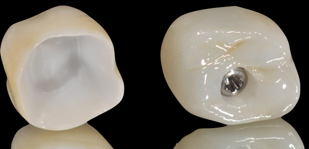 Unfortunately, randomized clinical trials for fully digitalized workflows for either teeth or implant-supported fixed restorations are scarce. Presently, a strong offering of rapid prototyping procedures exists, including CAD/CAM-produced full-contour or monolithic crowns (Figure 24) and milled frameworks combined with CAD/CAM veneering superstructures. A true digital workflow for crown-and-bridge is not mainstage at present, and barely exists in an analog-digital blend, but the authors believe this will change soon. The layering of porcelain is cumbersome and operator dependent with many working parts and lacks the consistent precision found with today's computerized technology. Joda described a threefold improvement in time efficiency, and either no or minor adjustments of implant-supported crowns, using a digital workflow (intraoral scanning and CAD/CAM technology) in comparison to conventional methods.20 Laboratory time savings have been most impacted by the digital workflow (average 54.5 minutes of production time versus 132.5 minutes), along with a 30% overall treatment cost reduction.21