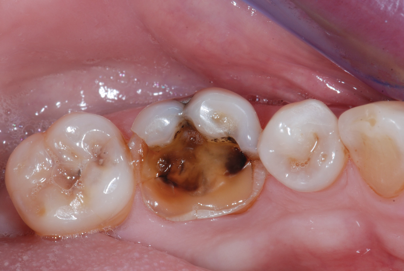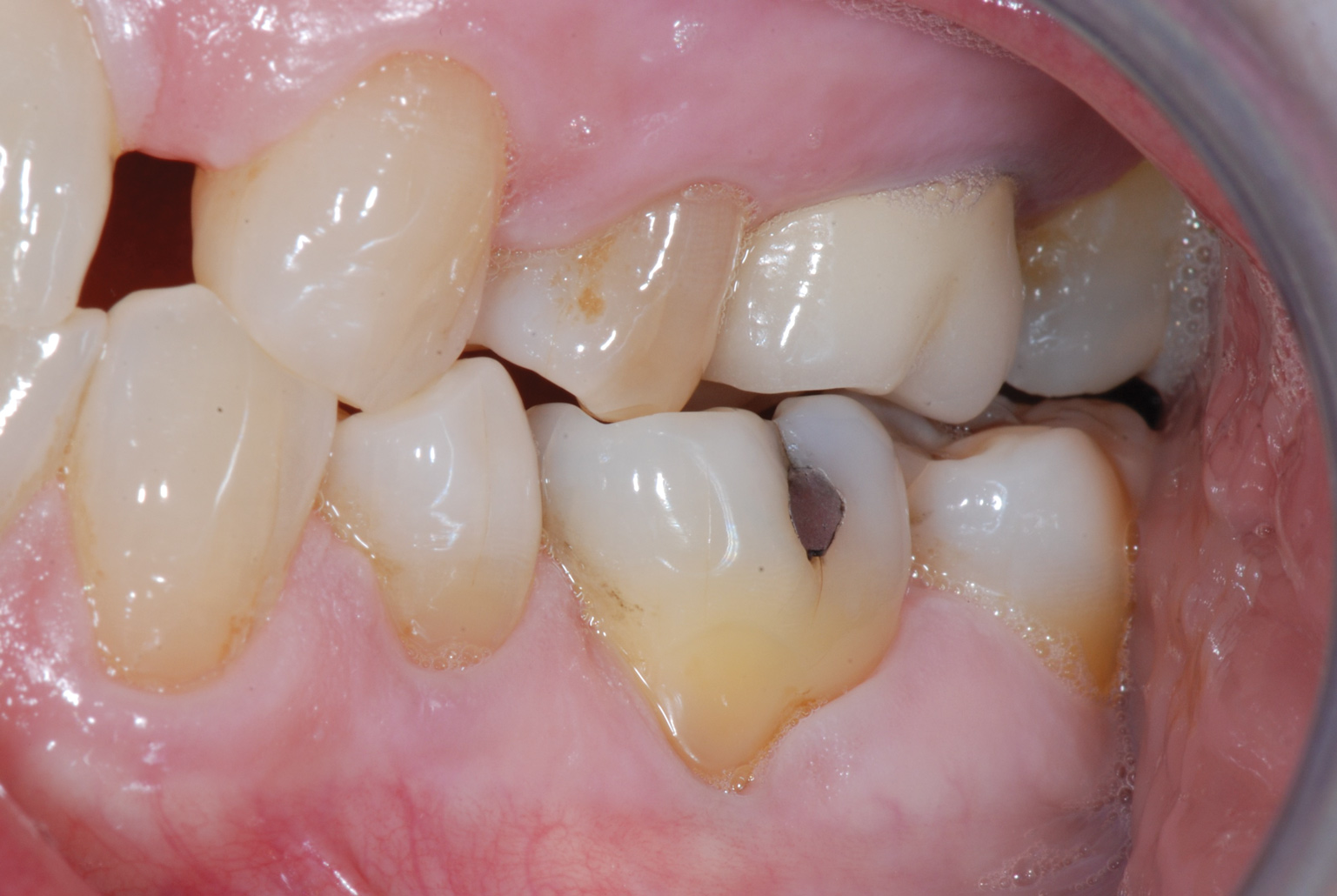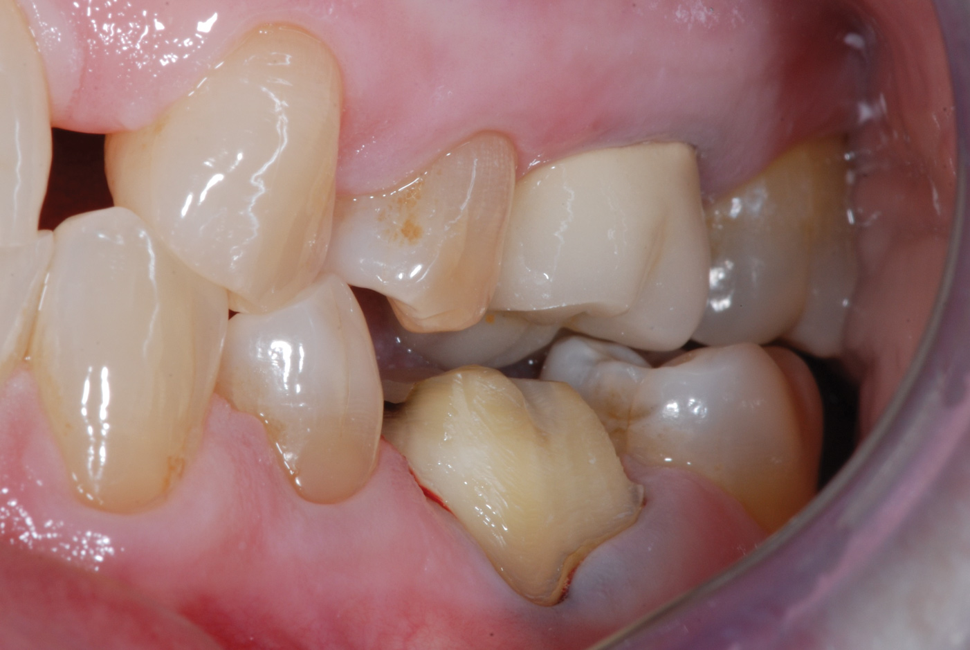 A 61-year-old female patient presented with a failed alloy restoration and missing the entire lingual surface of tooth No. 19 (Figure 2 and Figure 3). The argument could have been made to use either an onlay or a crown to replace the affected tooth. With the extent of the missing tooth structure, the malocclusion, and the patient's history of bruxism, treatment with a full-coverage restoration was selected to maximize longevity.