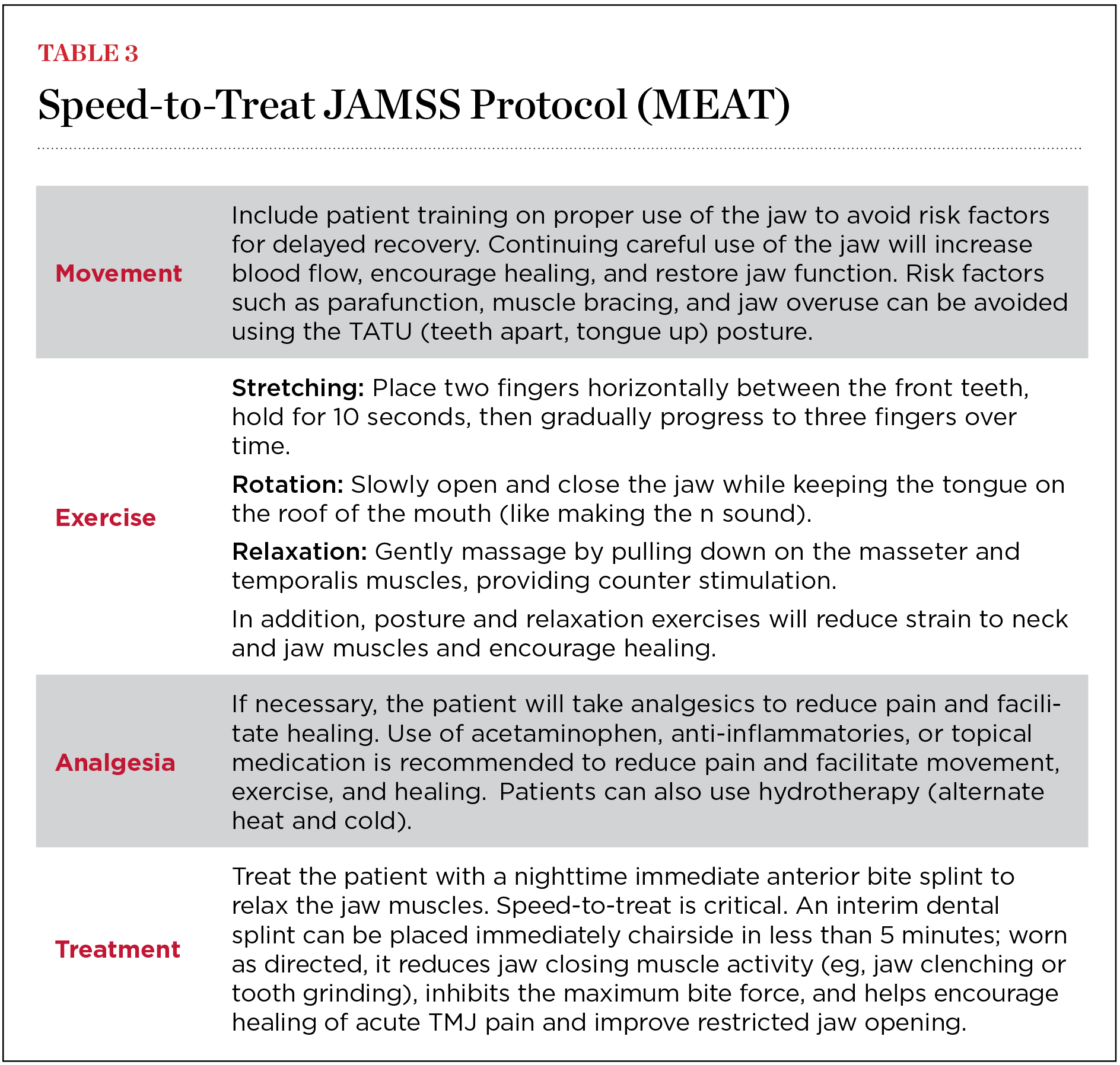 To minimize the risk that the patient will develop chronic jaw pain, earaches, temple headaches, or jaw dysfunction, a “speed-to-treat” JAMSS protocol is recommended.17,20 The sooner the protocol is initiated, the better the outcome. Being alerted to these signs and symptoms on the day they develop is ideal. The protocol includes four steps, known by the acronym MEAT: movement, exercises, analgesia, and treatment (Table 3). This orthopedic model engages patients in their own self-care, guides them on monitoring their condition and instituting behavior change, and augments their recovery with a simple device that is both diagnostic and therapeutic. Completing these four steps maximizes the potential for success in reducing pain and dysfunction at the acute stage.