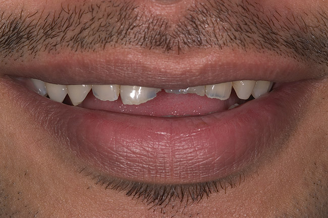 Examination revealed that palatal surfaces of teeth Nos. 6 through 11 showed severe loss of tooth structure, with mild wear on the lower incisors and loss of anterior guidance (Figure 5 through Figure 7). The palatal TSL was consistent with the clinical picture presented by patients with gastric reflux. A detailed medical history was taken, and the patient complained of having heartburn and acidity at least 4 out of 7 days a week. He had never sought treatment for it and used over-the-counter medication when needed. He was a nonsmoker, with occasional intake of alcohol. He had a high-stress job with irregular meal times. A thorough smile and dental analysis11 was carried out; the findings appear in Table 2.