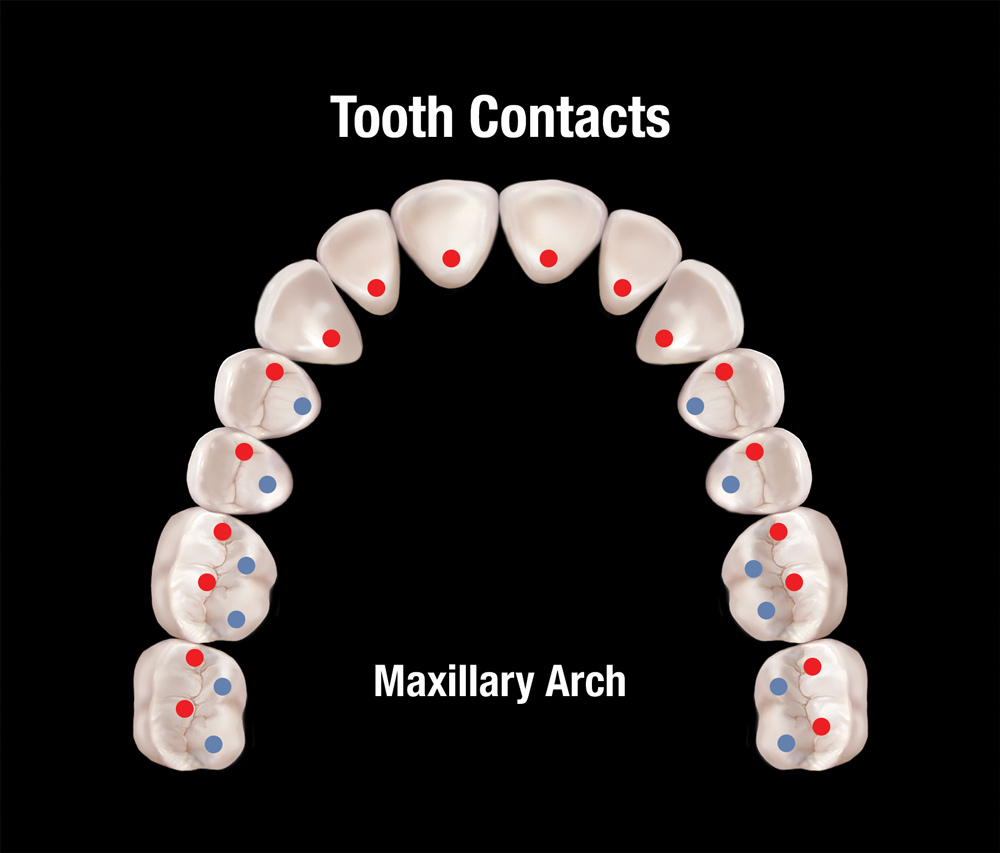 The first of Pankey’s three rules for occlusion is that all posterior teeth contact simultaneously when both condyles are in the fully seated CR position, as the anterior teeth contact equally or slightly less (Figure 4 and Figure 5). Essentially, every type of occlusal scheme, regardless of how the condylar position is determined, views simultaneous contact of all teeth as desirable. There are multiple benefits to this. First, the bite force is distributed more evenly over more teeth. Second, the lateral pterygoid muscles are not required to move or hold the mandible in an eccentric position. Third, an occlusal scheme of cusps contacting flat landing pads simultaneously with room around the inclines of the cusps will place forces down the long axis of the tooth without deflective lateral forces (Figure 6). Those deflective lateral forces can be responsible for various kinds of damage to teeth, restorations, gingiva, and bone. Finally, posterior teeth share the functional force generated by elevator muscles with both joints. With incisor-only contact, 60% of elevator muscle force is applied to the joints.14,15 With second molar contact, only 5% of the force is applied to the joints.14,15 In painful and unstable joints, it is critical to support them with abundant posterior tooth contacts.