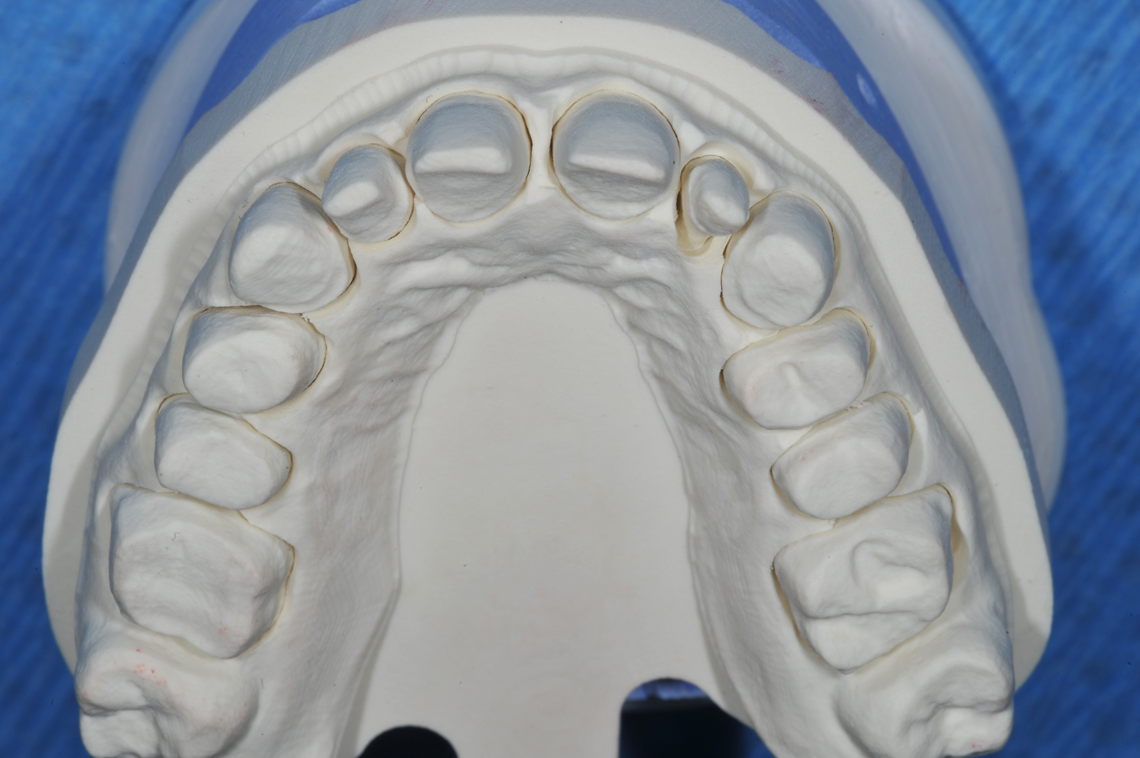 A thin layer of opaque flowable composite was placed, followed by a dentin opacity composite in a shade that roughly matched the dentin (Figure 6). Preparations were completed with a coarse diamond (NeoDiamond, Microcopy) with the goal of 1.5-mm occlusal clearance, chamfer margins, and rounded line angles to reduce internal stresses. Mandibular occlusion was adjusted to allow for crossbite correction in the final restorations.