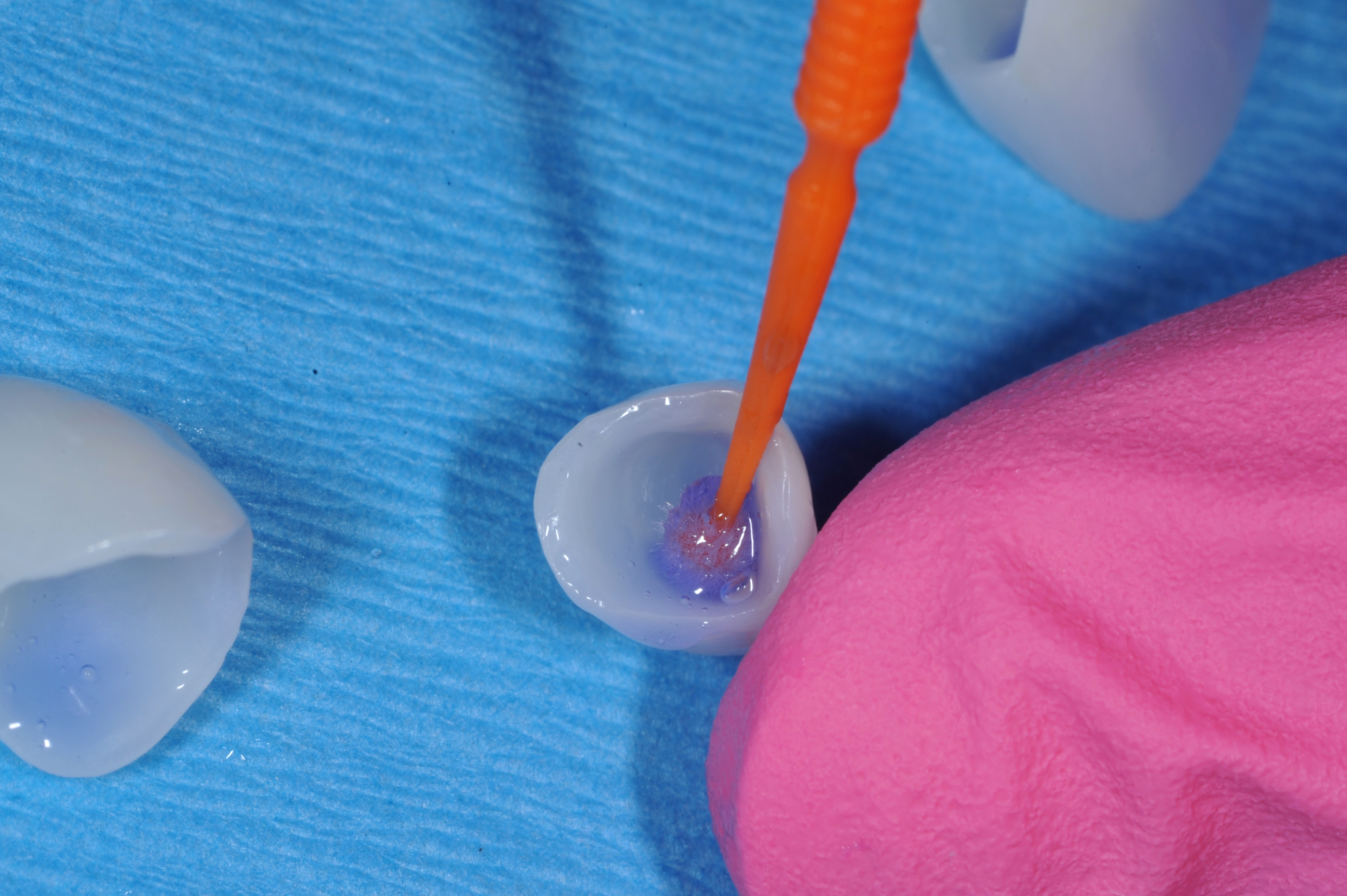 SARCs containing 10-MDP also form a reliable bond to a clean zirconia surface without the need for separate restoration primers or bonding agent as long as the surface is free of phosphates.24 During try-in, phosphates from oral fluids contaminate the intaglio surface and would interfere with the necessary phosphate bond from the 10-MDP, compromising its bond and subsequent retention25 (Figure 10). A restoration cleaner (ZirClean, Bisco) was used to remove such contaminants from the intaglio surface, which was then rinsed and dried (Figure 11).