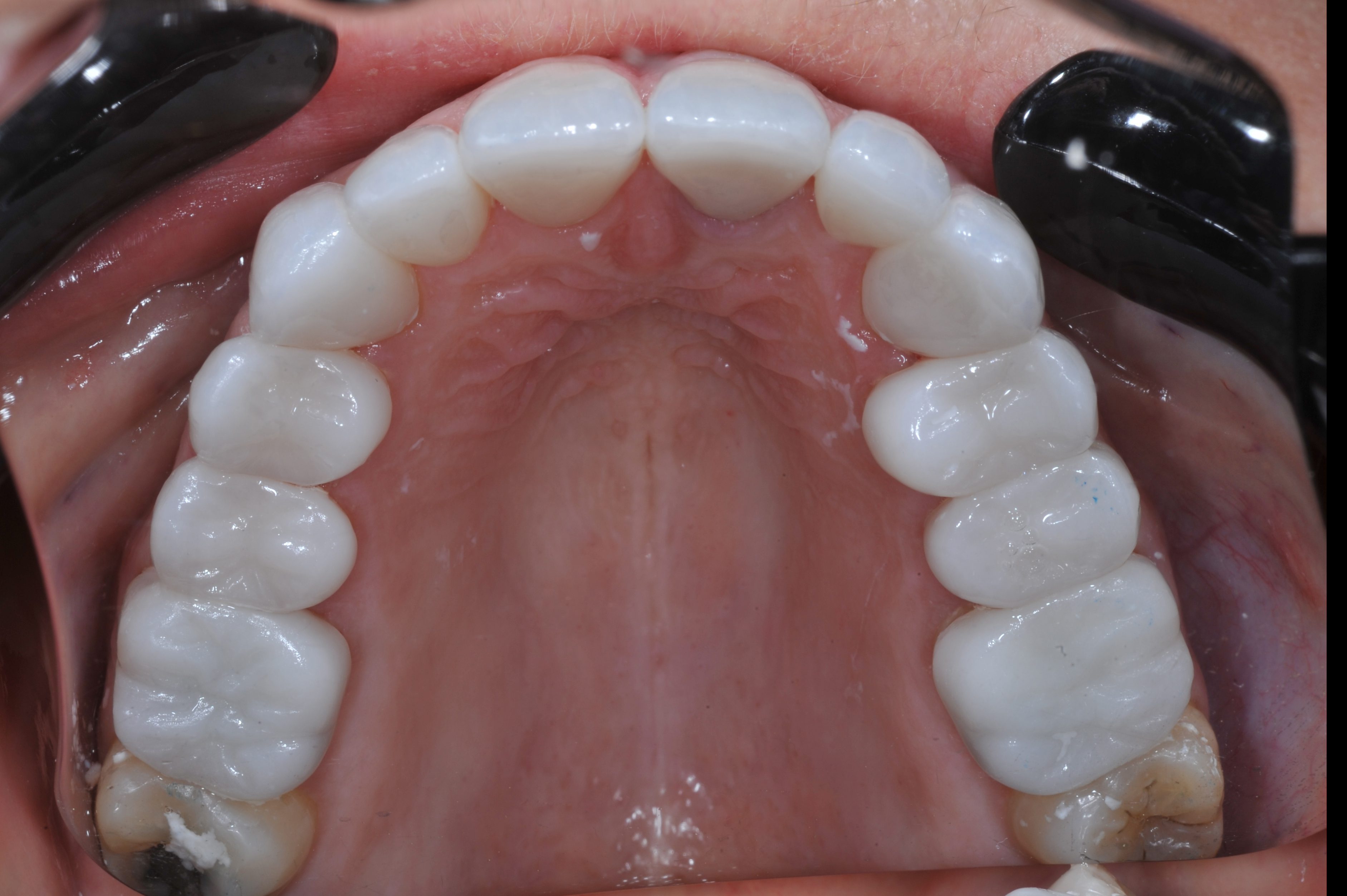A self-adhesive calcium silicate resin cement (TheraCem, Bisco) was used to cement all the restorations at once, starting from the incisors and working posteriorly (Figure 12). This 10-MDP cement comes in a "natural" shade and provides a strong bond to dentin and most modern dental materials, such as etched lithium disilicate and zirconia.26 The high calcium level in this calcium silicate cement gives the material a slightly opaque, white appearance but influences the final restoration color imperceptibly (Figure 13).