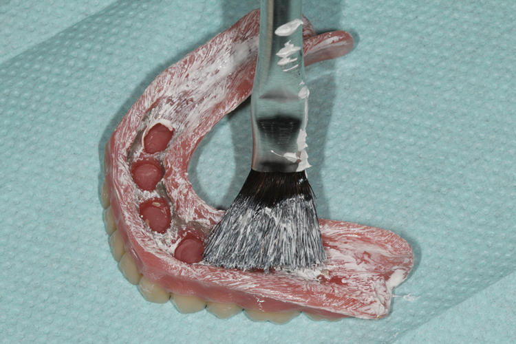 The prosthesis was then removed and air-dried, and denture disclosing media (Pressure Indicating Paste, Mizzy [alternatively: Pressure Disclosing Paste, Leemark Dental; Pressure Indicator Paste, Mark3]) was placed onto the entire intaglio surface using a brush (Figure 4). The paste was thoughtfully applied to the surface with emphasis on creating a linear streaked pattern (Figure 5). After the prosthesis is placed onto the edentulous ridge, any areas of contact between it and the denture-bearing surface can be rapidly visualized as disruptions in the streaked pattern.