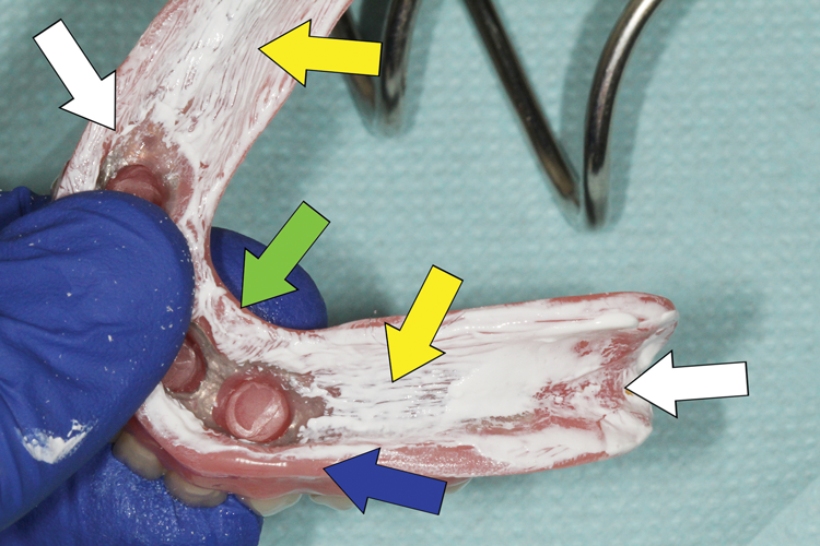 After the simulation of intraoral forces, the prosthesis was carefully removed to prevent further displacement of the disclosing media. It was then inspected to visualize any areas of pressure contact (Figure 7). Excessive pressure due to occlusal forces results in a wide saucer-like displacement of the disclosing media (white arrows), and this is typically found in the areas of the retromolar pad, alveolar ridge crest, and immediately surrounding the implant attachment housings. Areas of excessive movement due to anteroposterior forces are often found in the peripheral areas surrounding the facial and lingual border portions of the anterior region of the prosthesis (green arrow). Excessive pressure areas caused by oblique dislodging forces are visualized by a lack of paste at the periphery of the prosthesis in the areas of the residual canine or premolar regions (blue arrow). Any areas where the streaked pattern is undisrupted on the intaglio surface of the prosthesis indicate an absence of tissue contact and the presence of space between the tissues and the denture base (yellow arrows).