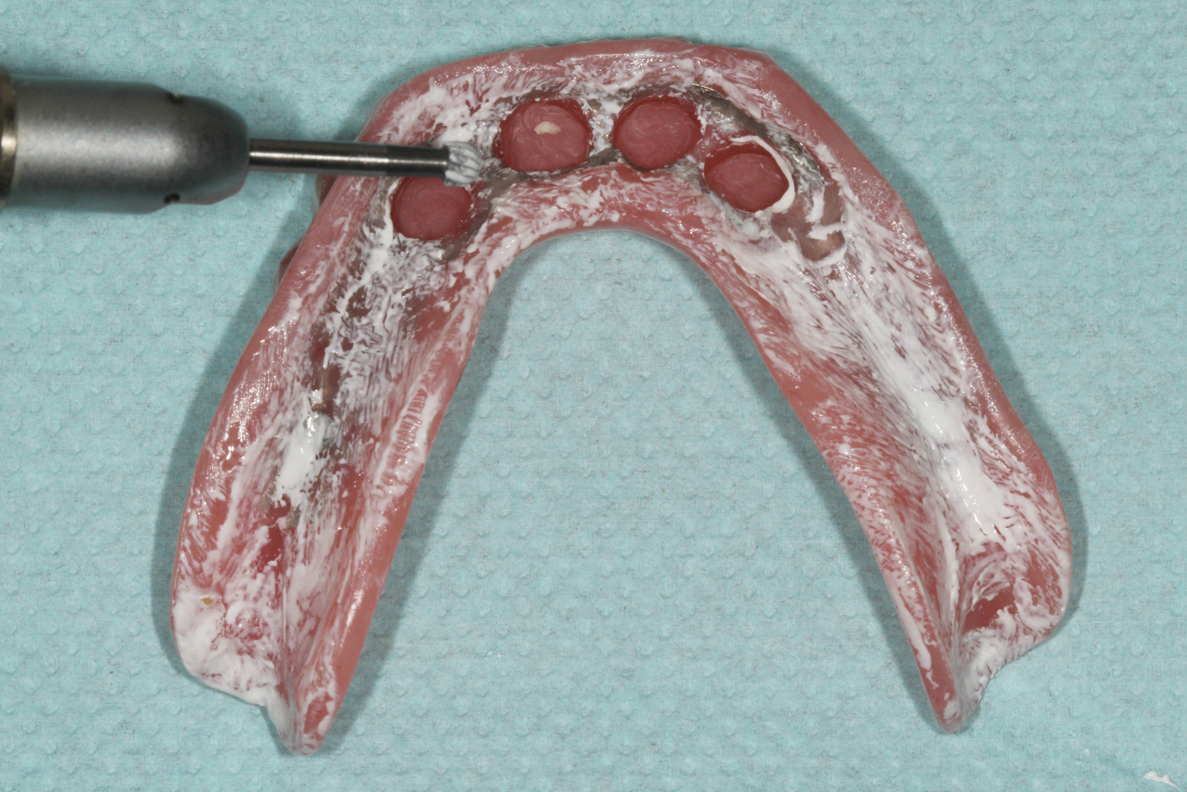 Prosthetic adjustments to the areas of excessive pressure were made using acrylic burs to relieve the areas of paste displacement. First, any pressure areas caused by occlusal forces were adjusted by relieving the areas where heavy pressure was noted with a medium- to large-sized round bur using moderate speed and light force (Figure 8). The anteroposterior pressure areas were adjusted next, and the oblique pressure areas were adjusted last. Both of these pressure areas, which are typically visualized with longer, narrower areas of paste displacement, were adjusted with a tapering acrylic bur using low speed and moderate force. A highspeed handpiece with a large football-shaped carbide bur can assist in adjusting any areas where a metal framework is in excessive contact with the soft tissues.