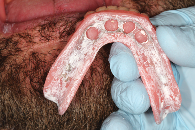 A patient was referred to the practice by another clinician for the fabrication of a functional, stable prosthesis. He presented with four existing implants in the anterior mandible that were fitted with stud-style attachments (LOCATOR®, Zest Dental Solutions [alternatively: Stern SNAP®, Sterngold; OT Equator, Rhein83]) (Figure 1). The implants, which had been placed approximately 6 months prior, appeared healthy and well-integrated. An earlier attempt to fabricate an overdenture had resulted in an overextended prosthesis that rocked significantly. After multiple attempts to adjust the prosthesis, it had become excessively thin and ultimately fractured during function.