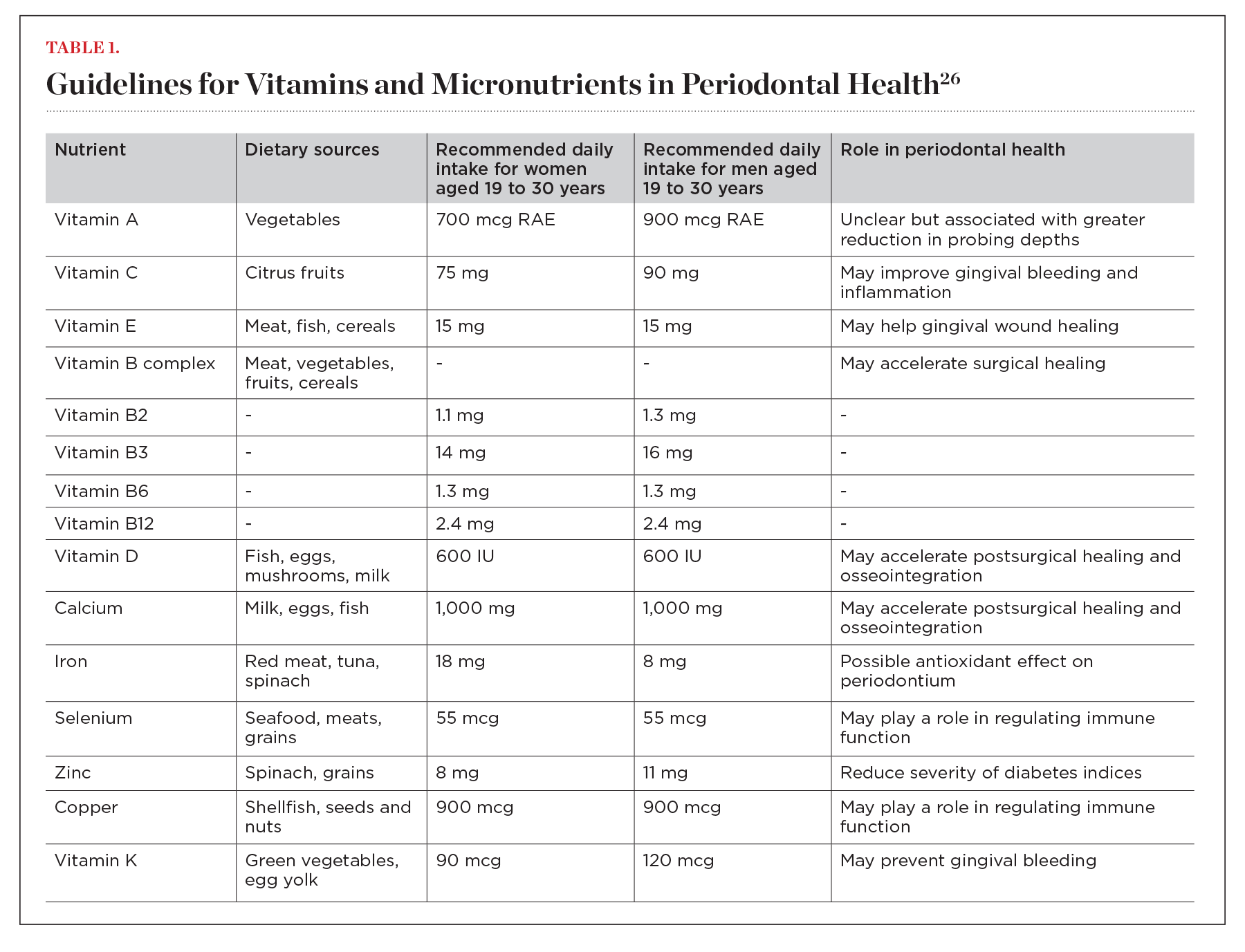 To maintain optimal periodontal health and maximize the response to periodontal therapy, excellent nutrition is critical. Table 1 outlines the recommendations for the daily intake of micronutrients and the current evidence regarding their individual roles in improved periodontal health before, during, and after periodontal therapy.26 Possible mechanisms for the relationships between micronutrients and periodontitis development, progression, and wound healing have been proposed based on the underlying mechanisms of action of the individual micronutrients. Although available research regarding the supplementation of micronutrients indicates promising results, further investigation is necessary. Additional randomized, controlled, longitudinal human studies are still needed to develop a more robust understanding of the relationships between individual micronutrients and periodontal health. It should be noted, however, that because the medical literature supports nutrition's critical role in wound healing processes and the maintenance of overall health, following the recommendations for daily micronutrient intake is not only beneficial to oral health but also beneficial to systemic health. Host susceptibility remains a necessary element of the onset and progression of periodontal disease; therefore, the modulation and influence of such susceptibility by improving micronutrient levels may improve and maintain periodontal health. Because nutrient supplementation is associated with minimal or no adverse effects, demonstrating the abilities of micronutrients to enhance treatment outcomes could reveal them to be a valuable adjunctive tool in the management of periodontal diseases.