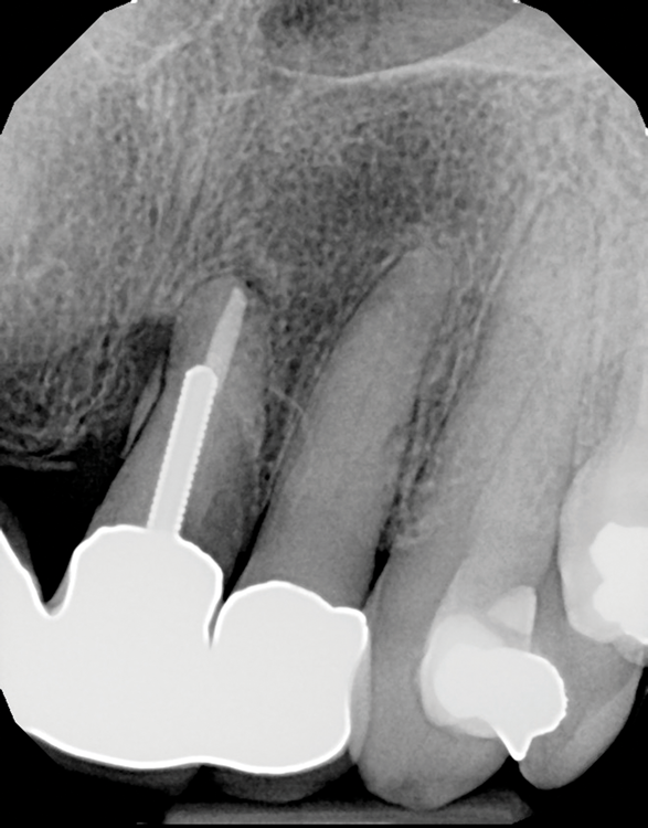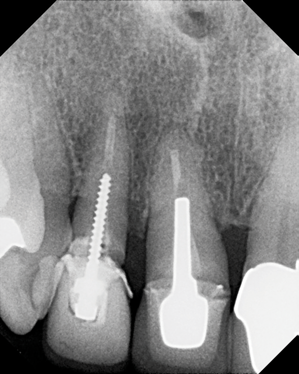 Today, most post and core restorative treatments employ a prefabricated post made from either metal or fiber. Although the trend has been toward the use of fiber posts, early in the transition from indirect to direct post and core protocols, metal posts were primarily used. Prefabricated metal posts are available in two basic shapes: parallel and tapered. In addition to being highly radiopaque, metal posts are extremely rigid, possessing a high modulus of elasticity of 100 GPa to 200 GPa, and transfer more stress from the coronal aspect to the thinner apical segment.3 Because of the "wedge effect," tapered metal posts can be more threatening to the remaining tooth structure. This was especially true with the early threaded posts, which readily came loose (Figure 3) or resulted in a fractured root.