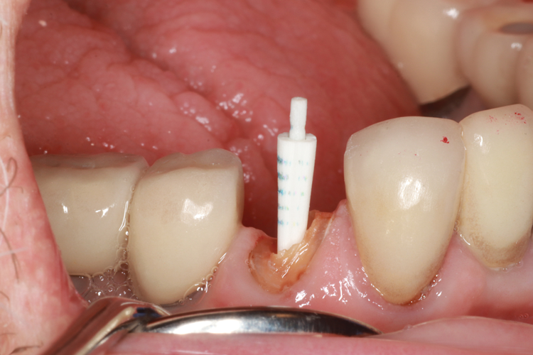 Fiber posts have been developed that can be used a direct/indirect technique. In this technique, after the post is tried into the canal, it is removed, and a light-cure composite is placed around it to fill in the voids inside the tooth. Once reseated in the canal, the composite is preliminarily light cured, removed, and then further cured extraorally to ensure optimal polymerization. The result is a strong core mass, which has been shown to help save remaining tooth structure.15 As with the traditional custom cast post technique, relined fiber posts require that all undercuts be eliminated in order to ensure a clear path of insertion. This method has been shown to improve fracture resistance of the restored root.18