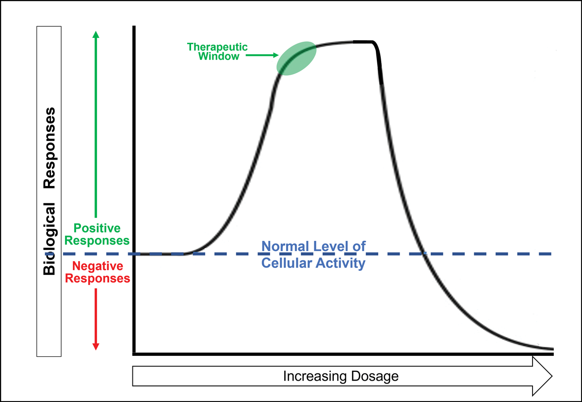 As the light energy from PBM enters the tissue being treated, it can be transmitted, scattered, reflexed, or most importantly, absorbed. Low levels of light energy penetrate into tissues where they interact with and are absorbed by endogenous chromophores located in cells, resulting in nondestructive photophysical and photochemical changes that lead to alterations at the molecular, cellular, and tissue levels of the body. Due to the biphasic nature of light absorption by tissue, depending on the dosage, PBM can either stimulate or inhibit a biologic response in a manner that is often described using the Arndt-Schultz law (Figure 1).3,4