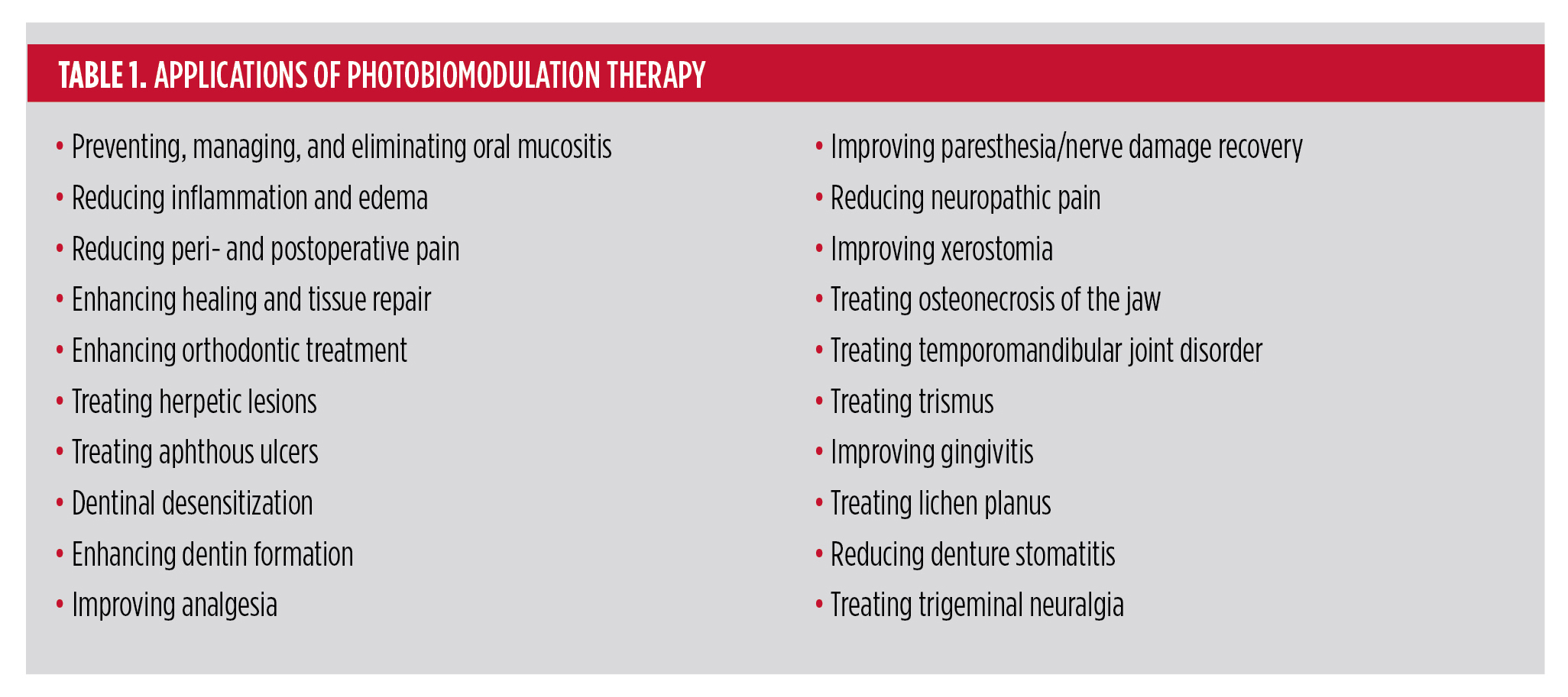 PBM's ability to assist in controlling inflammation and edema leads to a reduction in pain while enhancing tissue repair, which makes it an ideal adjunctive therapy that can be administered both pre- and postoperatively for many routine oral procedures (Table 1). Today, the use of PBM is strongly recommended to assist in the prevention and management of oral mucositis in cancer patients,7,8 and it has even been shown to assist in alleviating tissue fibroses associated with graft-versus-host disease.9-11