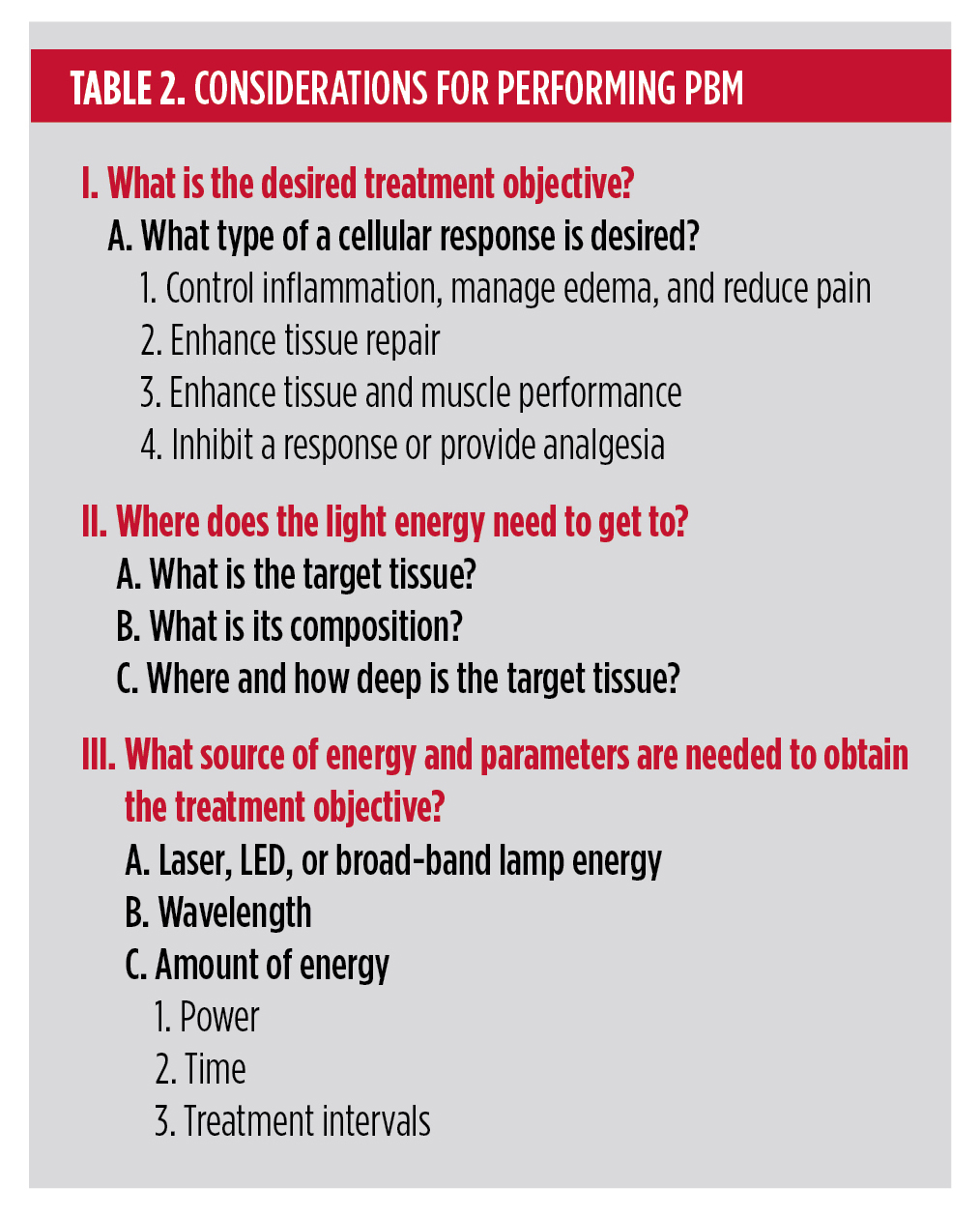 Today, with the appropriate PBM devices and protocols, clinicians have the ability to efficiently deliver effective doses of light deep into tissues to accelerate healing and enhance treatment outcomes, reduce inflammation and pain, and achieve other beneficial results. To obtain the desired effects of PBM, it is imperative that clinicians have clear objectives and goals for treatment, a comprehensive understanding of laser/light physics, and knowledge regarding the location and composition of the target tissue (Table 2). Clinicians should also be properly trained in the techniques and protocols specific to the devices used as well as understand the benefits and limitation of the technologies.
