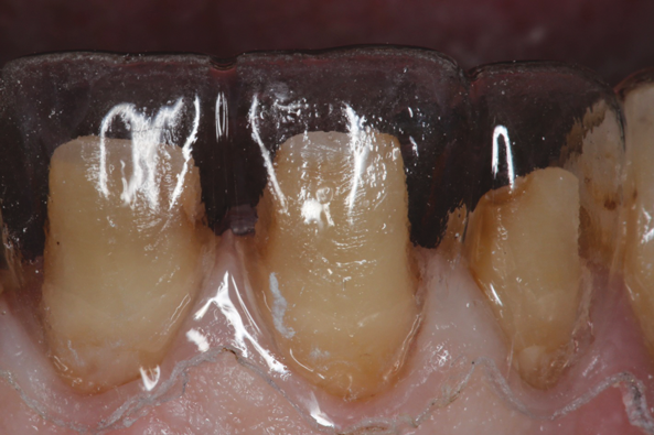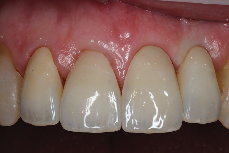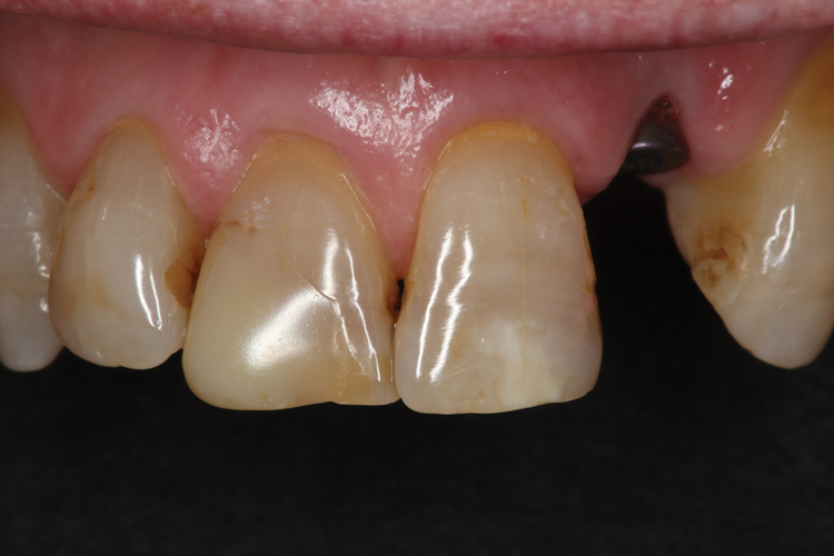 A 68-year-old woman presented with decay affecting teeth Nos. 5 and 6 to the extent that they were non-restorable. Both teeth were extracted, and the sites were grafted. After a healing period, an implant was placed into each site, and custom contoured healing abutments were delivered (Figure 2). After another healing period, the emergence profile established would ensure that there was ideal contour of the restorations, passive fit to minimize or eliminate tissue blanching on delivery, and because a digital workflow was to be used, ideal visualization of the scan bodies (Figure 3). Appropriate scan bodies were hand tightened into the fixtures and upper and lower full-arch scans were acquired (Figure 4). During digital design, it was noted that although the tooth No. 5 site could accommodate a straight-channel screw-retained restoration, using the same design for tooth No. 6 would place the access on the incisal edge (Figure 5). This would be an esthetically challenging location as well as subject the access to a higher rate of wear during lateral excursive movements. Therefore, a design with an angulated screw channel was chosen for tooth No. 6, which addressed the complications that would occur with a straight channel (Figure 6). Although both implants were the same platform size and from the same manufacturer, due to the nature of attaching the restorations, on delivery, tooth No. 5 was torqued to 35 Ncm while tooth No. 6 was torqued to 25 Ncm (Figure 7). The screw channels were then blocked with polytetrafluoroethylene (PTFE) tape, and the access holes were restored with a universal composite. The end result blended with the surrounding dentition in form, function, and esthetics (Figure 8).