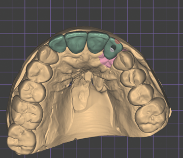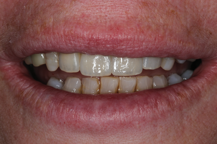 A 55-year-old woman presented to the practice missing tooth No. 10, which had previously fractured due to decay. In addition, teeth Nos. 7 through 9 had large multi-surface fillings that were failing (Figure 9). Due to the esthetic demand and the anticipated amount of missing tooth structure, a diagnostic wax-up was digitally designed (Figure 10). The diagnostic wax-up was then 3D printed and used to fabricate a clear stent. During the preparation phase, the stent was intermittently used to verify that the amount of reduction was adequate and in accordance with the digital design (Figure 11). Temporary crowns were fabricated from a bis-acryl material and delivered, and the patient was dismissed to be seen 2 weeks later to ensure that there were no changes in the soft-tissue architecture. A bone-level implant was placed in the tooth No. 10 site. Due to the depth of the fixture, a conventional impression coping would provide a more ideal fit and visualization of site No. 10 for the design of the final implant-supported restoration. Therefore, a final upper impression was taken using a polyether impression material. During design, an angulated screw channel was chosen to place the access opening in its ideal position (Figure 12). Because the final restorations for teeth Nos. 7 through 9 were going to be conventionally cemented, the order of delivery was planned such that the tooth No. 10 restoration would be delivered last. This allowed for the complete removal of any excess cement from teeth Nos. 7 through 9 so that it would not compromise the implant site (Figure 13). The patient's smile exhibited an ideal amount of display, and the restorations blended well with the surrounding dentition (Figure 14).