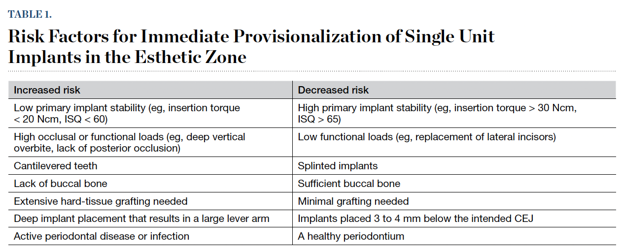 The immediate replacement of a single missing tooth with a dental implant in the esthetic zone is among the more challenging scenarios faced by clinicians. As such, it requires special attention to planning and execution at each stage of treatment and often necessitates the modification of "standard" implant workflows. The delivery of a provisional restoration immediately following placement of an implant and graft materials is justified and advantageous when specific criteria are met.1-4 Immediate provisonalization protocols are not appropriate for every implant site; therefore, the careful consideration of key risk criteria is essential to case selection and to improve the prognosis and predictability (Table 1). For example, implants with low primary stability, such as those with insertion torque values less than 20 Ncm or implant stability quotient (ISQ) values less than 60, as well as a high occlusal or functional load, a lack of buccal bone, or the presence of active periodontal disease are all factors that increase the risk of a poor prognosis for immediate provisionalization protocols. Implants with a high primary stability of greater than 30 Ncm or an ISQ value greater than 65 decrease the risk of a poor prognosis for immediate loading protocols. Other factors that decrease the risk of a poor prognosis include low functional loads, the presence of sufficient buccal bone, and implants that are placed 3 to 4 mm below the intended cementoenamel junction (CEJ).