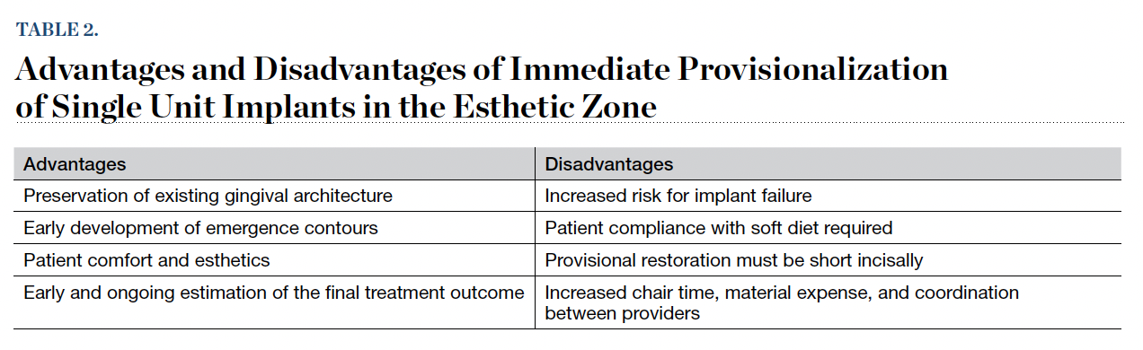 There are both advantages and disadvantages associated with this treatment (Table 2). Specific advantages of immediately provisionalizing implants in the esthetic zone include preservation of the existing gingival architecture, the early development of emergence contours, and the ability to better estimate the final treatment outcome. Disadvantages of provisionalizing implants at the time of placement include increased risk of implant failure and the need for patient compliance with a soft diet. When immediately placed implants are provisionalized at the time of placement, patients initially benefit by the rapid return to form (ie, esthetics) but not to function because they are not to "use" the provisional restoration. At the definitive stage, both patients and clinicians benefit from the increased esthetics and predictability that are provided by a properly designed provisional restoration.5-8