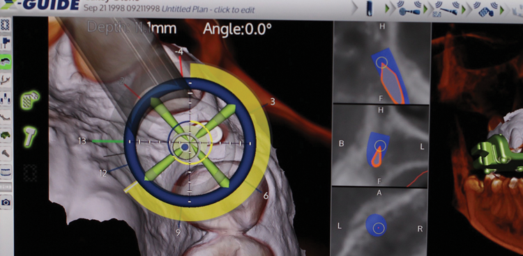 If the soft-tissue volume is acceptable and the tooth to be replaced is still present, the 3-dimensional CBCT scan should show its incisal position in relation to the tooth in the opposing arch. If the patient is missing the tooth to be replaced, the radiographic guide should show the ideal crown position, and the contours of the crown should be visible on the CBCT scan that is taken. The radiographic guide may then be converted into the surgical template. The surgical template should show the labial surface of the future crown to limit the labial angulation of the implant. Ideally, screw-retained provisional crowns for anterior teeth have their access channels positioned to exit through the cingulum.