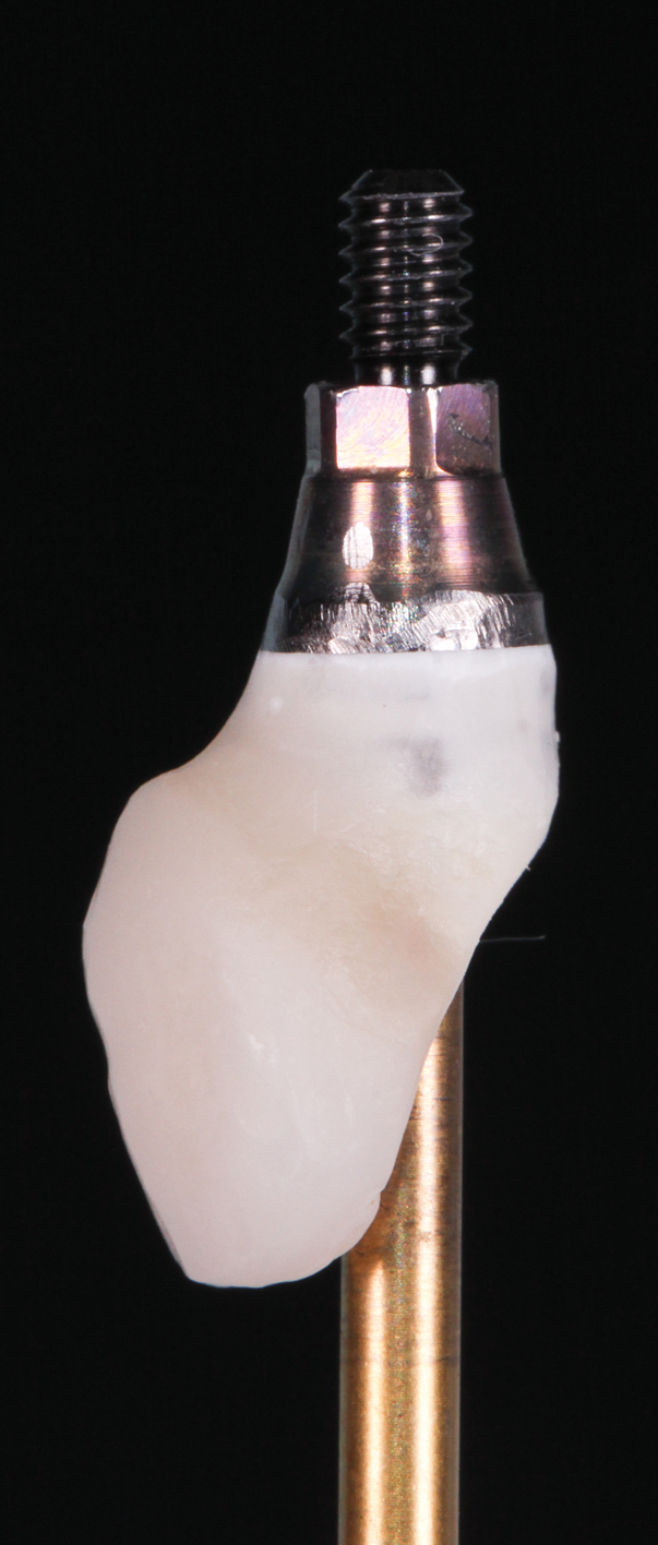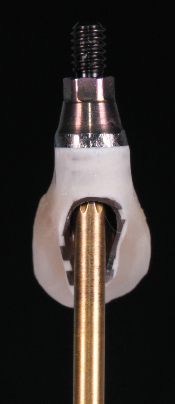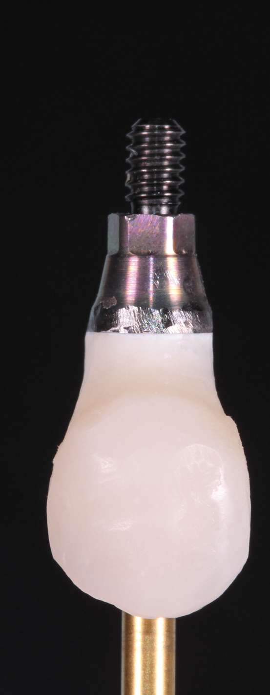 Fabrication of an immediate provisional restoration requires the selection of an appropriate implant provisional abutment and the creation of a tooth shell. Among other materials, commonly used implant provisional abutments are made from polyether ether keytone (PEEK), PEEK/titanium hybrid, or solid titanium (Figure 1). They can have engaging or non-engaging designs and are also sometimes available in various collar heights. Low-collar, engaging solid titanium provisional abutments offer advantages over others due to their high fracture strength, narrow dimensions, controllable emergence contours, ability to be torqued to high values, and robust seal at the implant abutment junction. However, they present the disadvantages of being slightly more expensive, harder to cut, and metallic in color. The metallic color can be mitigated by applying a flowable opaquing composite resin prior to attaching it to the crown shell. Solid titanium provisional abutments are best cut with a high-speed carbide bur or a metal cutting disc on a straight handpiece. They will heat up during cutting, but this can be easily managed by grasping them with a hemostat or analog and occasionally placing them into a cool water bath. The tooth shell can be fabricated from composite using a stone or resin model (Figure 2 through Figure 10) or from the patient's existing tooth or crown.